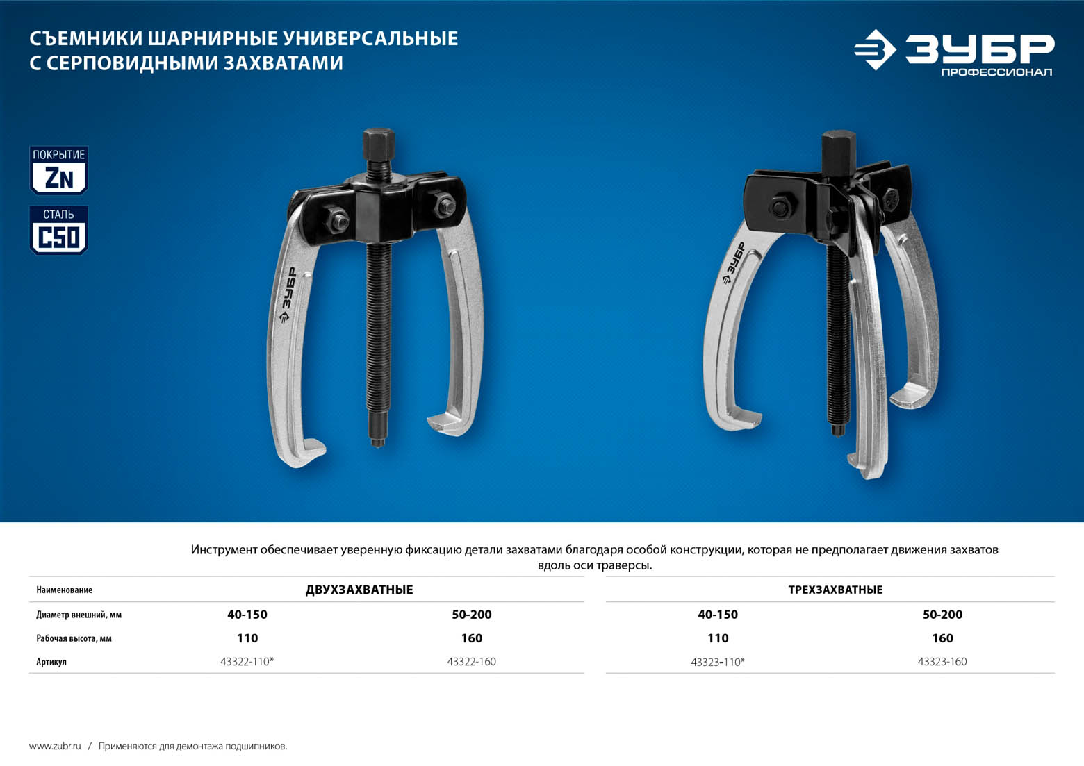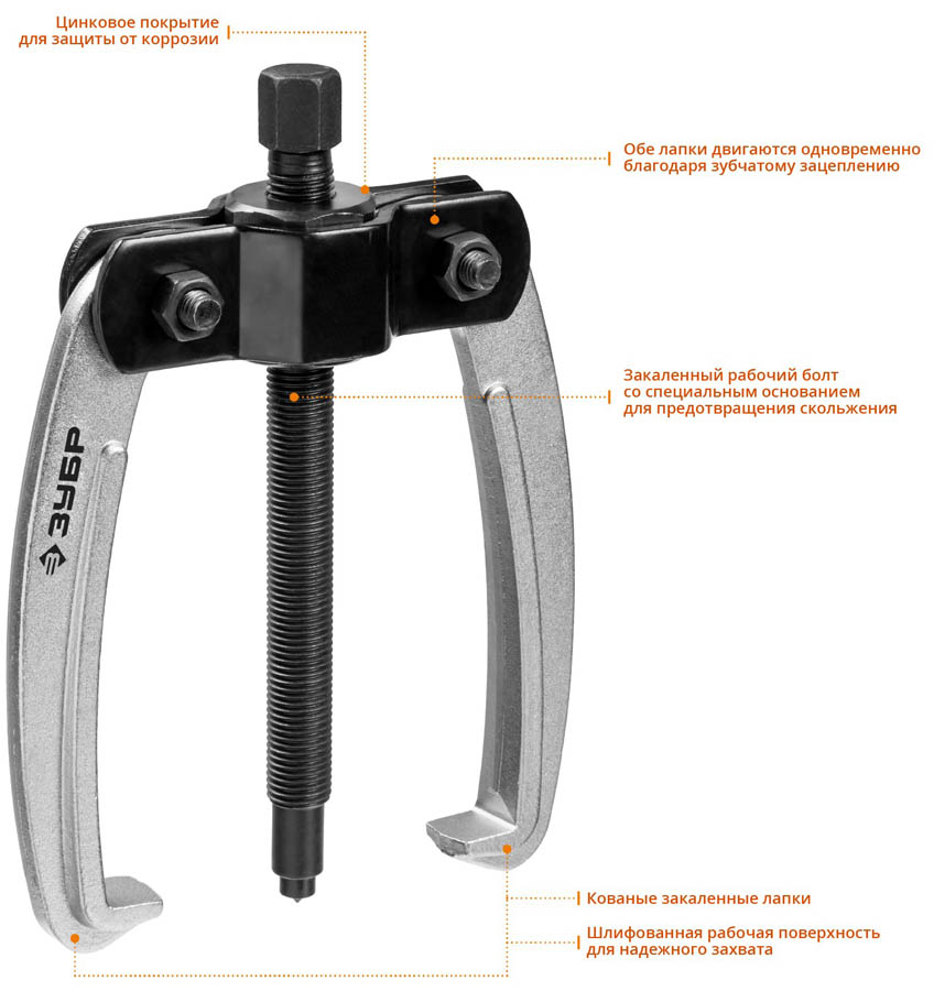 Съемник шарнирный 2-захватный с серповидными захватами, 160 мм, ЗУБР Профессионал 43322-160