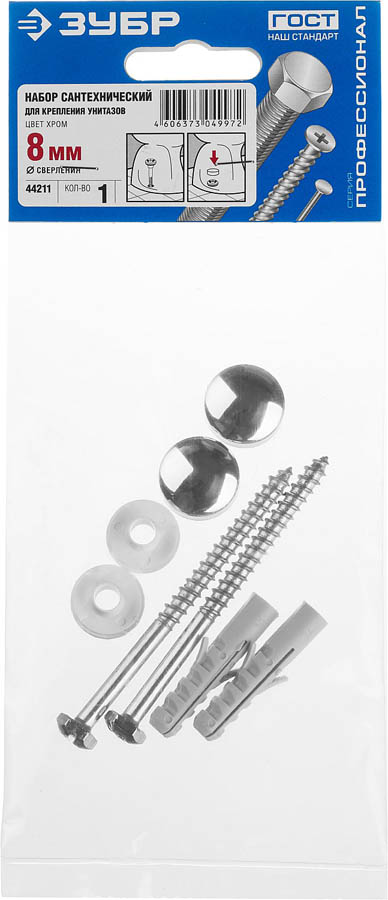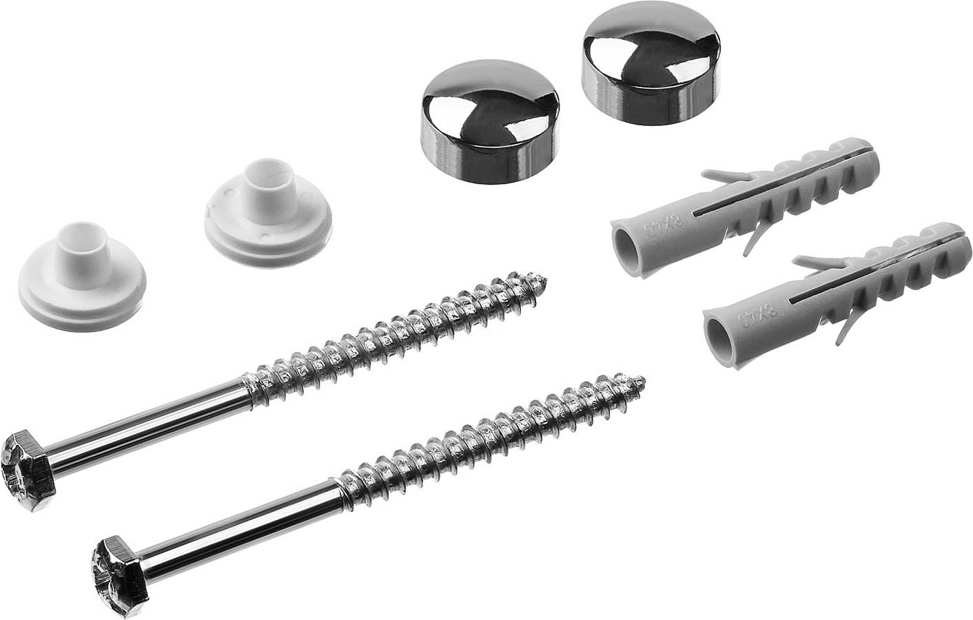 Набор ЗУБР 44211, применяется для крепления унитазов к бетонному или кирпичному основанию. Диаметр предварительного сверления: 10 мм. Наборы для крепления сантехники предлагают широкий выбор готовых решений для простого и удобного крепления различных видов сантехники (раковин, унитазов, писсуаров). Набор включает в себя полный комплект крепежных изделий, необходимых для установки унитаза: дюбели, шурупы, декоративные колпачки и втулки пластмассовые. Декоративные колпачки цвета хром фиксируются на установленных шурупах и способствуют улучшению общего эстетического вида.