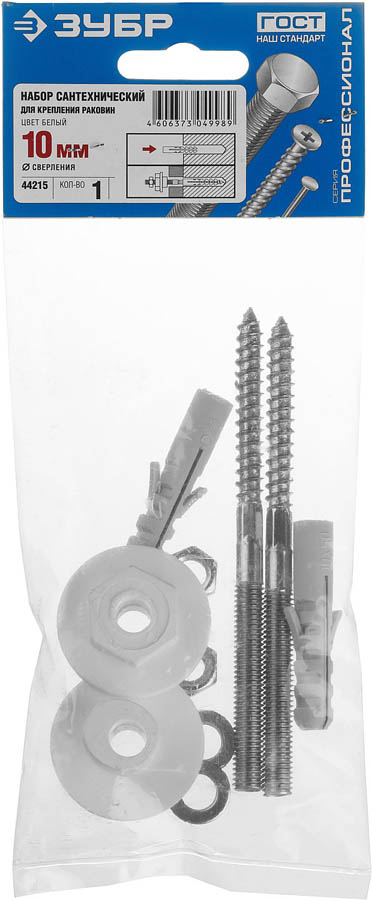 Набор ЗУБР 44215, применяется для крепления раковин к бетонному или кирпичному основанию. Диаметр предварительного сверления: 14 мм. Наборы для крепления сантехники предлагают широкий выбор готовых решений для простого и удобного крепления различных видов сантехники (раковин, унитазов, писсуаров). Набор включает в себя полный комплект крепежных изделий, необходимых для установки раковины: дюбели, шурупы, шайбы, гайки и втулки пластмассовые