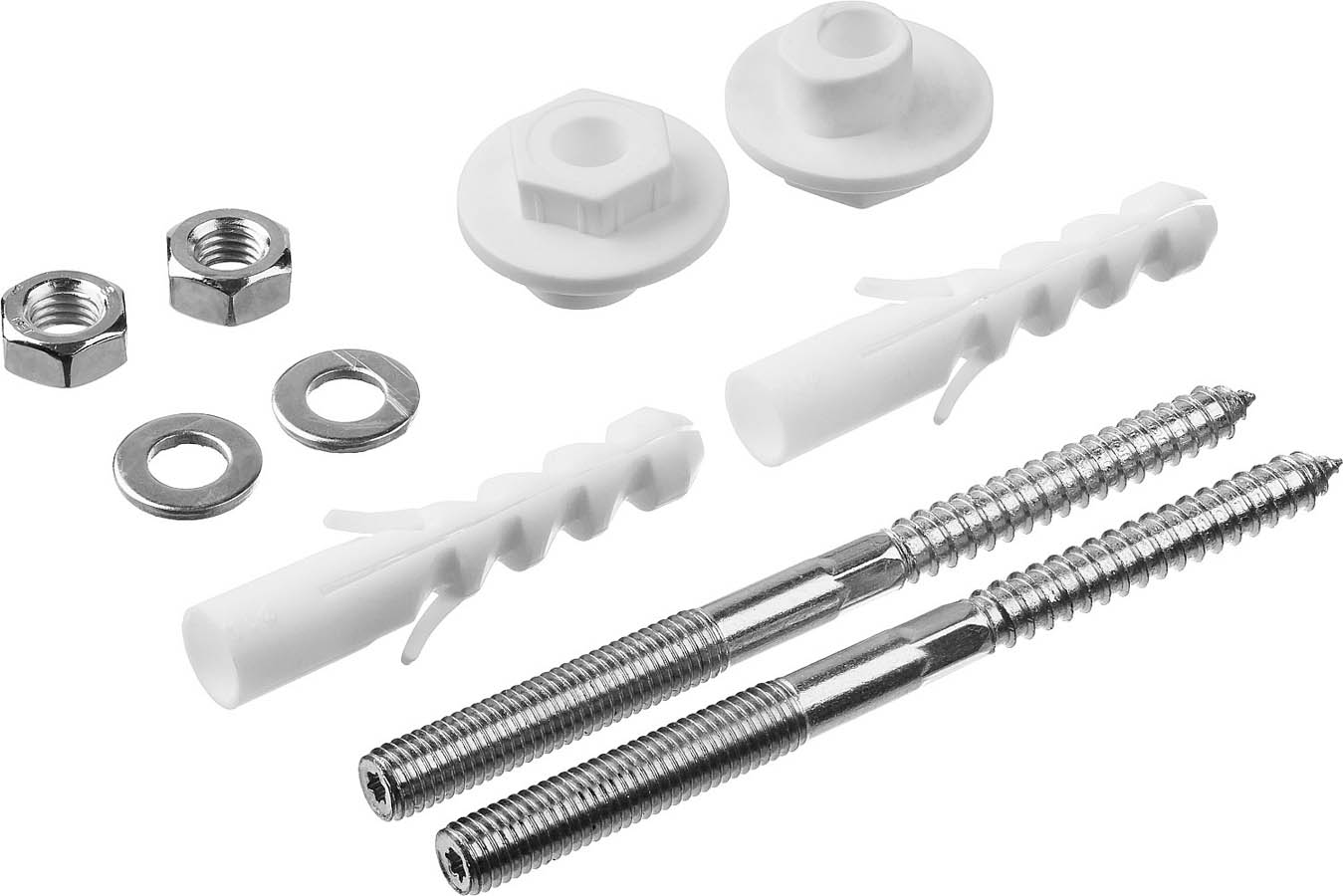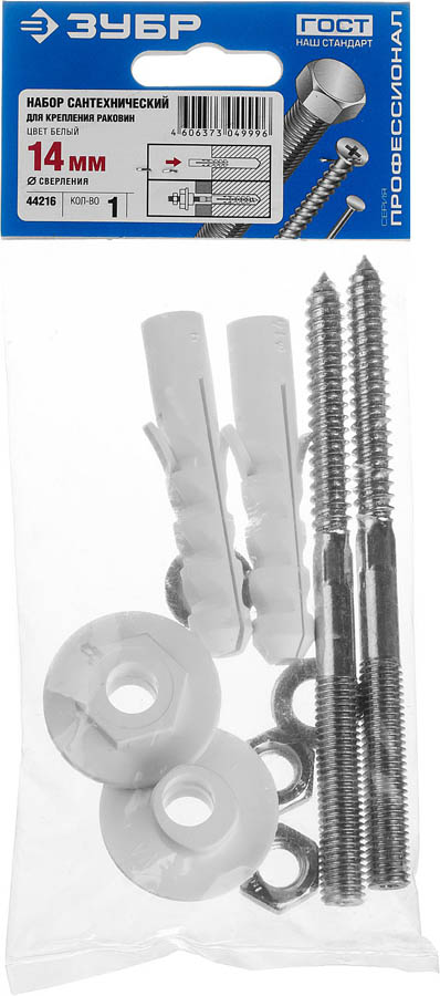 Набор ЗУБР 44216, применяется для крепления раковин к бетонному или кирпичному основанию. Диаметр предварительного сверления: 14 мм. Наборы для крепления сантехники предлагают широкий выбор готовых решений для простого и удобного крепления различных видов сантехники (раковин, унитазов, писсуаров). Набор включает в себя полный комплект крепежных изделий, необходимых для установки раковины: дюбели, шурупы, шайбы, гайки и втулки пластмассовые