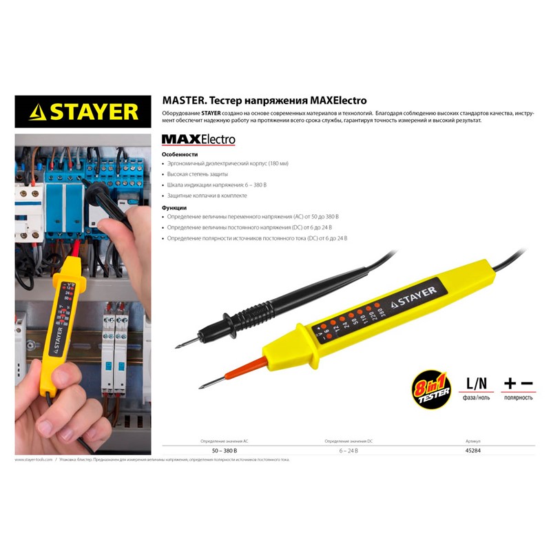 Тестер напряжения STAYER 45284, предназначен для определения величины напряжения в проводниках. При наличии напряжения загорается световой индикатор. Корпус изделия выполнен из высококачественного пластика.