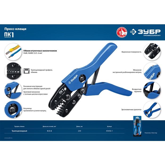 Пресс-клещи для втулочных наконечников ПК-1 45456-3 Зубр