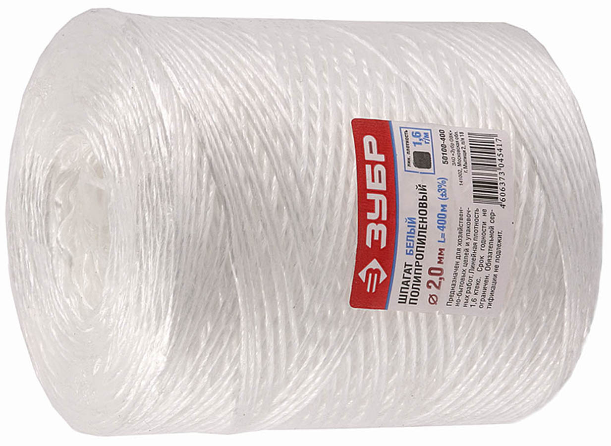 Шпагат ЗУБР полипропиленовый, d=2,0 мм, 400м, белый, 22 кгс, 1,6 ктекс
