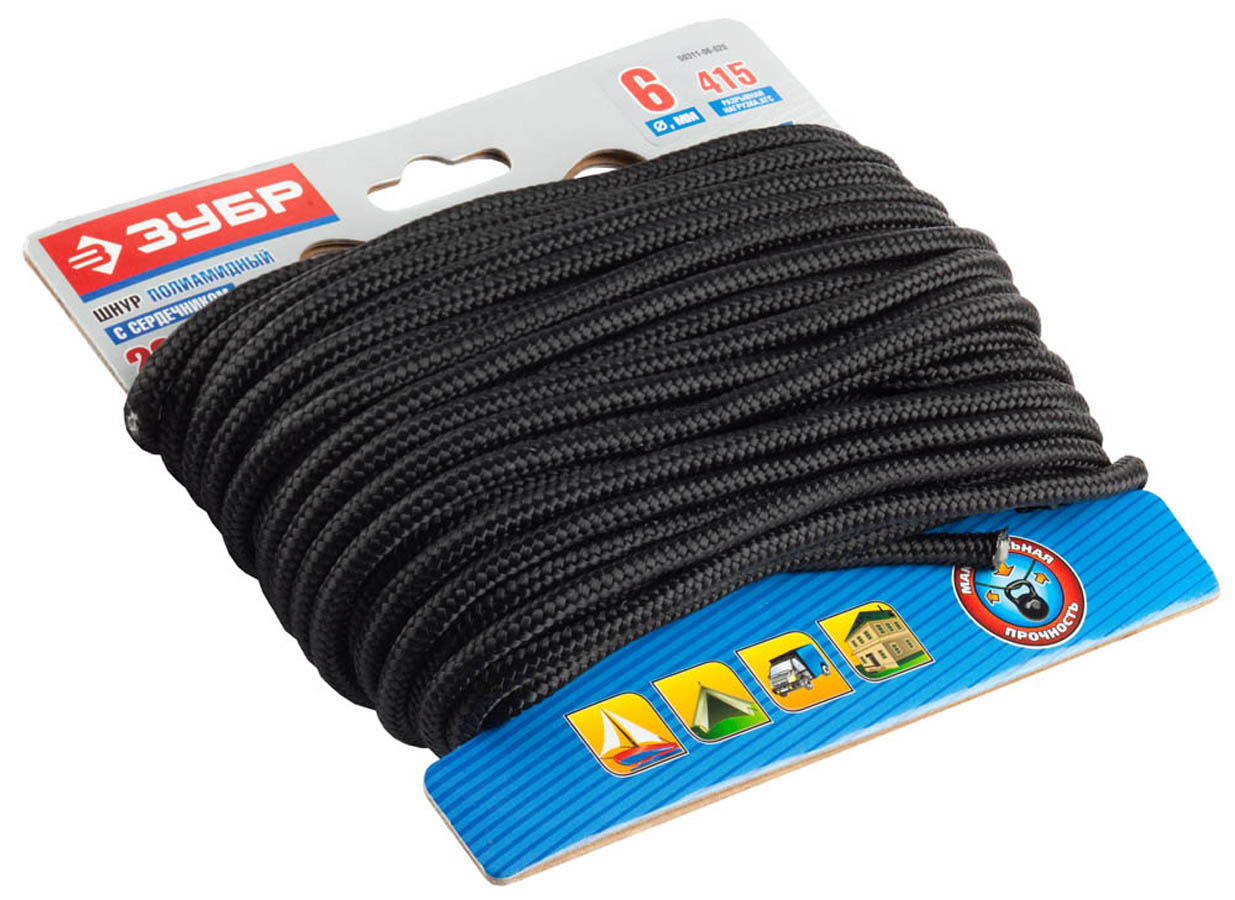 ЗУБР 20 м, 6 мм, плетеный, повышенной нагрузки, с сердечником, черный, шнур полиамидный 50311-06-020