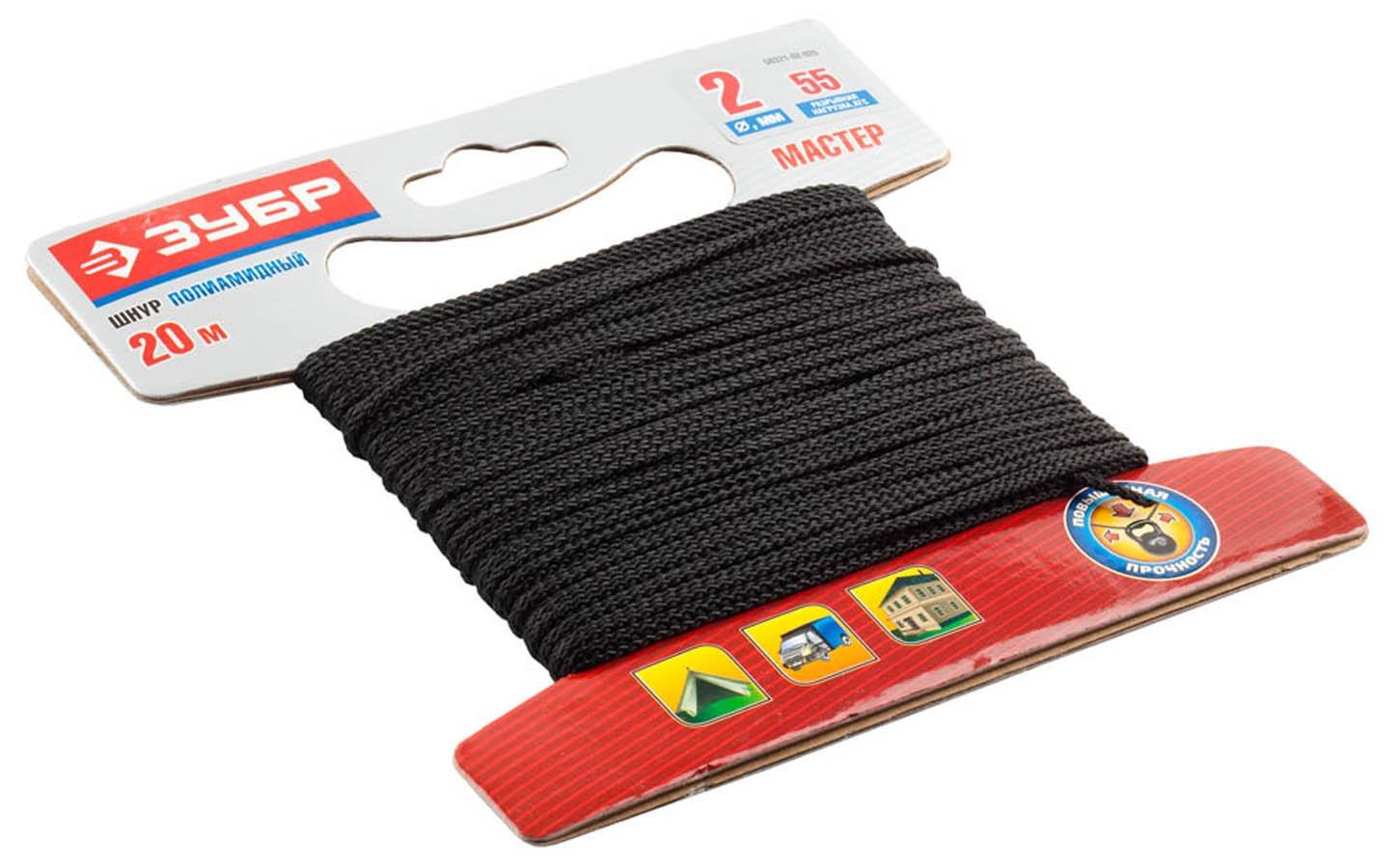 ЗУБР 20 м, 2 мм, плетеный, повышенной нагрузки, без сердечника, черный, шнур полиамидный 50321-02-020