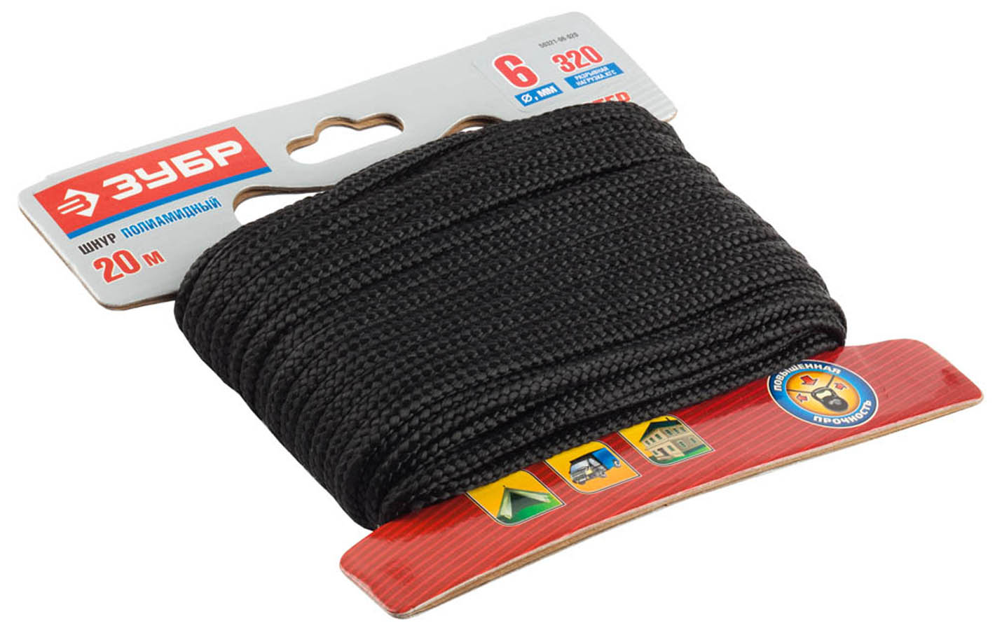 ЗУБР 20 м, 6 мм, плетеный, повышенной нагрузки, без сердечника, черный, шнур полиамидный 50321-06-020