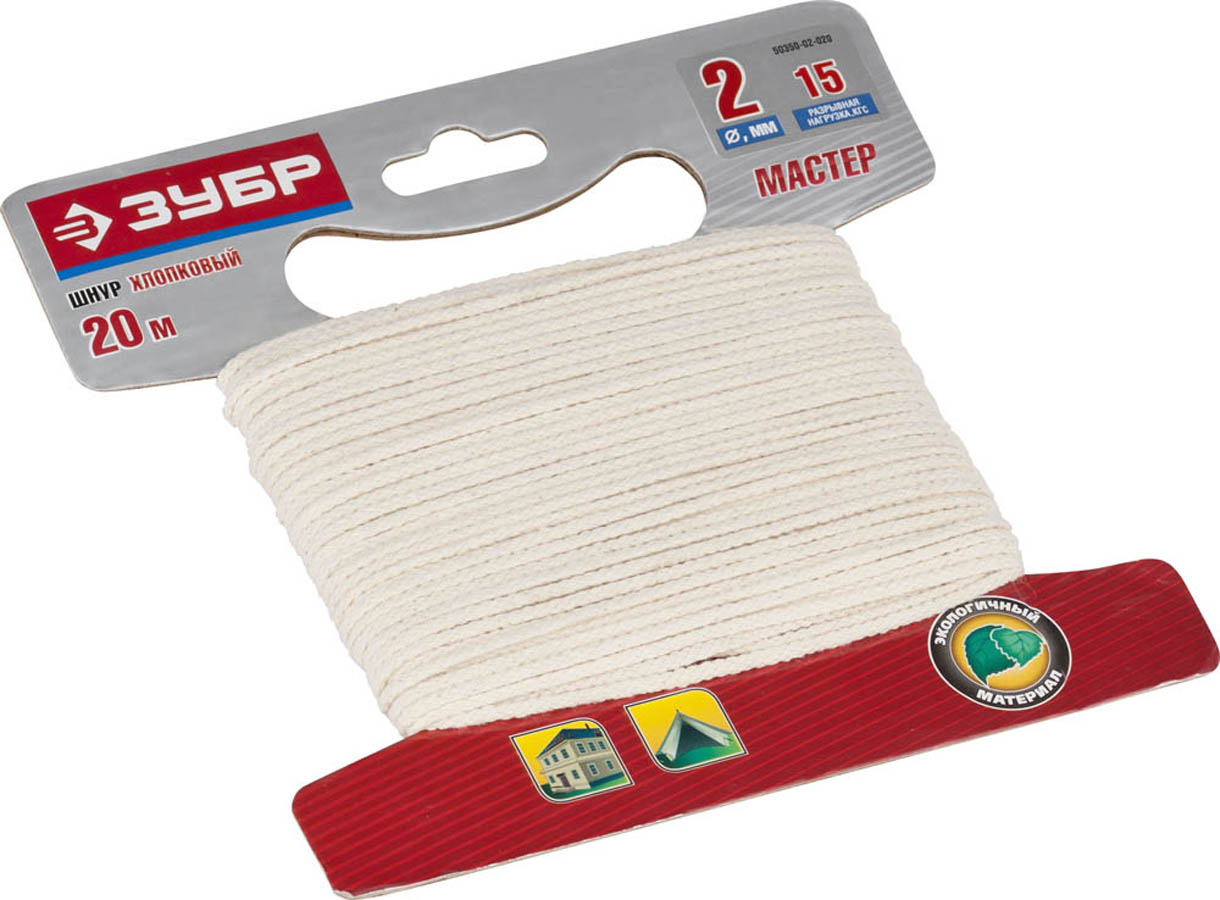 ЗУБР 20 м, 2 мм, плетеный, натуральный, без сердечника, шнур хлопковый 50350-02-020