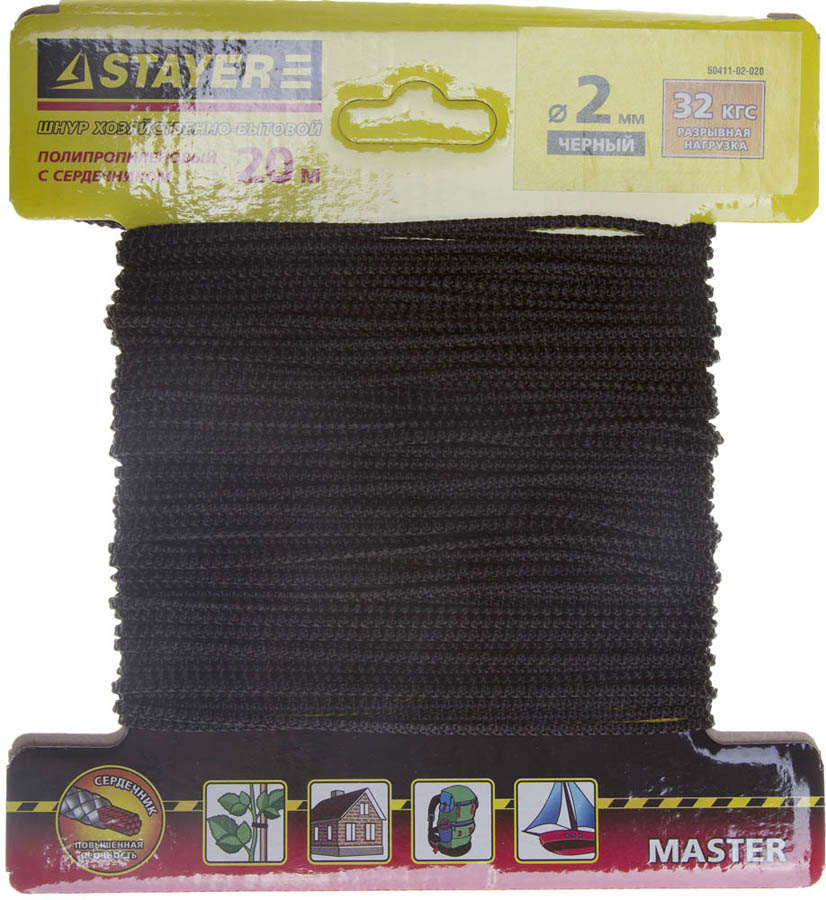 Шнур STAYER "MASTER" хозяйственно-бытовой, полипропиленовый, вязанный, с сердечником, черный, d 2, 20м