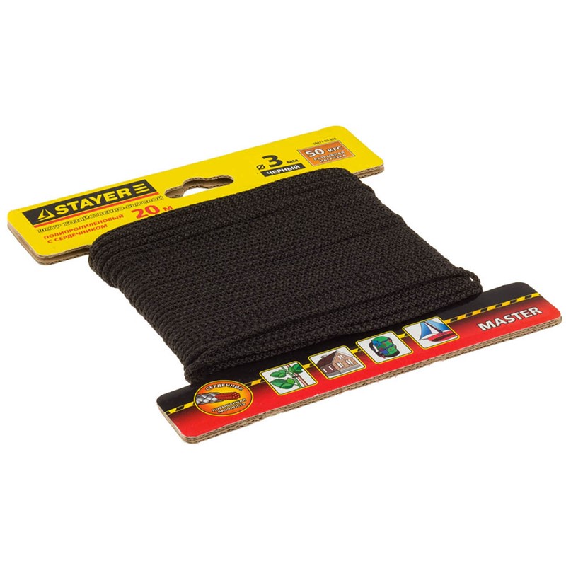 Шнур STAYER "MASTER" хозяйственно-бытовой, полипропиленовый, вязанный, с сердечником, черный, d 3, 20м