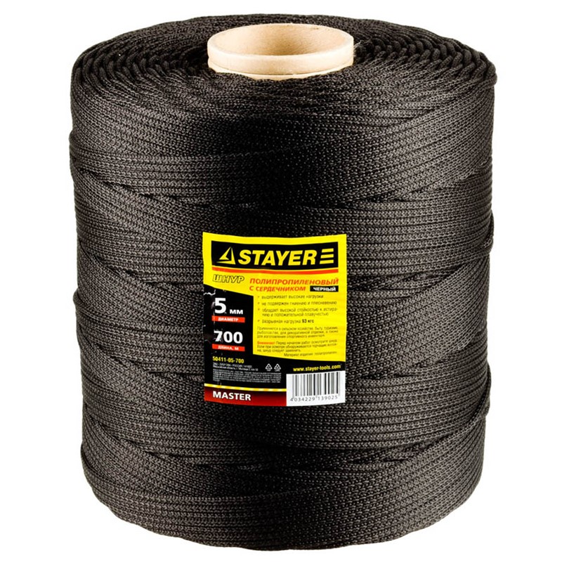 Шнур STAYER "MASTER" хозяйственно-бытовой, полипропиленовый, вязанный, с сердечником, черный, d 5, катушка 700м