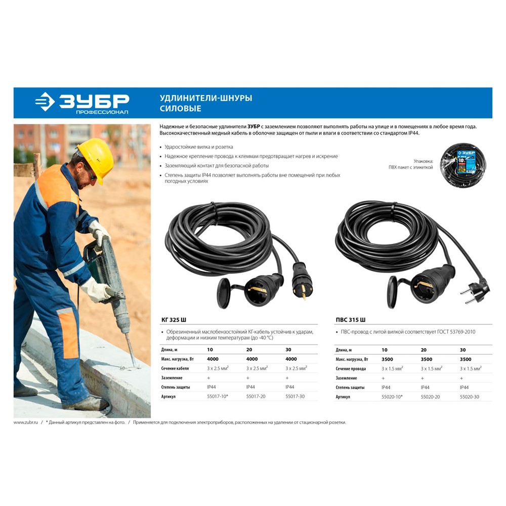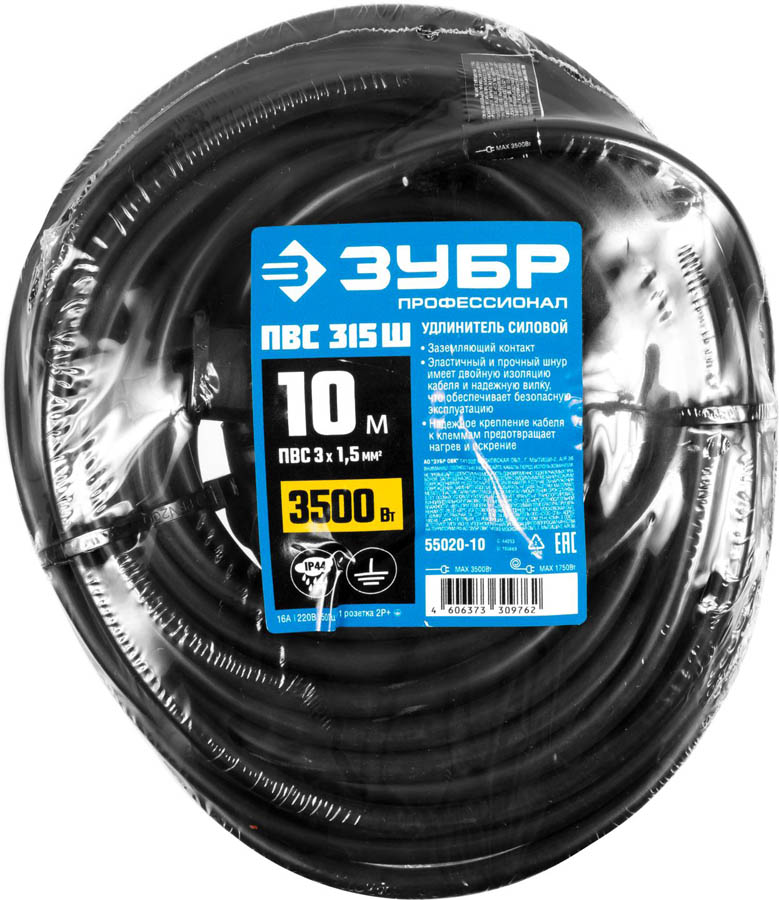 ЗУБР 10 м, 3500 Вт, 1 гнездо, IP44, удлинитель электрический силовой 55020-10