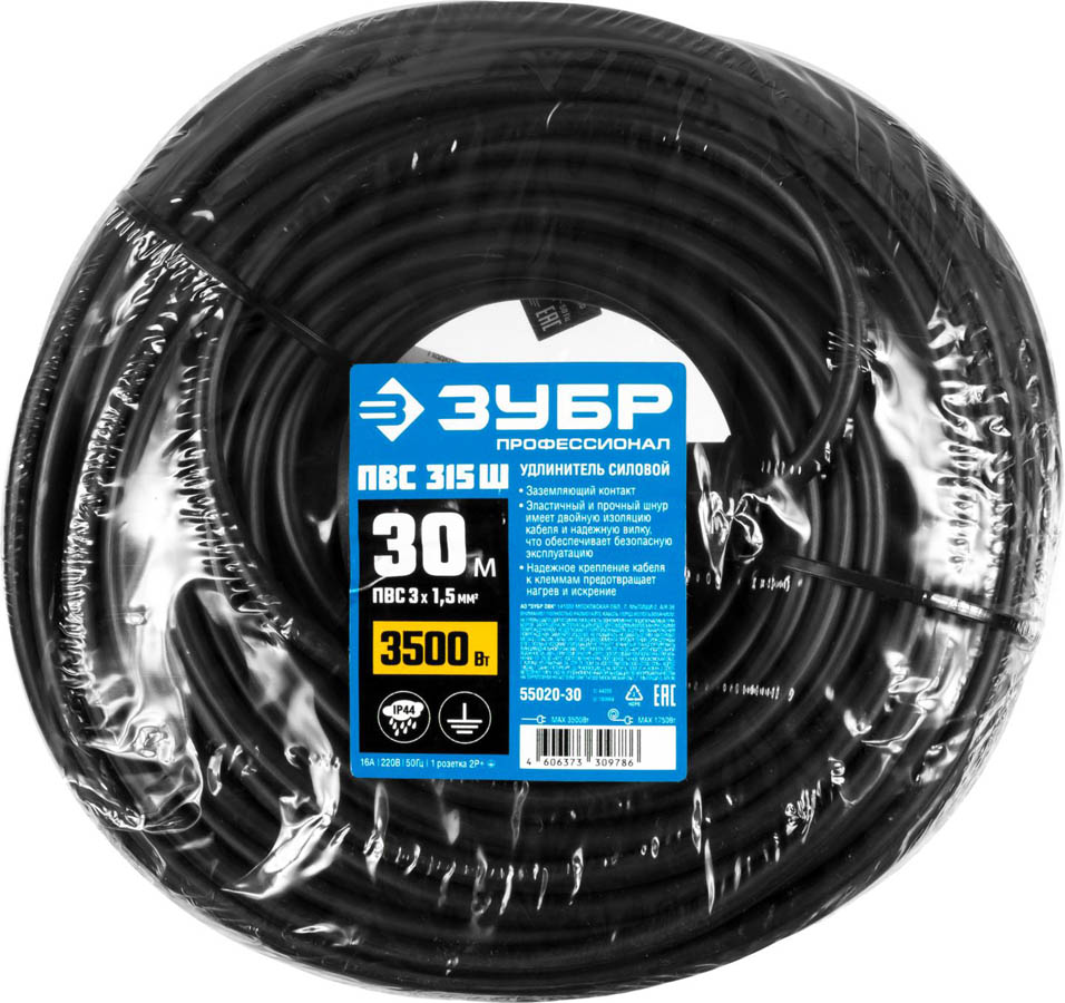 Удлинитель-шнур ЗУБР 55020-30, предназначен для подключения электрических приборов, которые находится на удалении от основного источника сети. Состоит из провода типа ПВС черного цвета и одной розетки. Облегчит работу на приусадебном участке, стройке или в быту. Заземляющий контакт Степень защиты - IP44 Эластичный и прочный соединительный шнур имеет двойную изоляцию кабеля и надежную вилку, что обеспечивает безопасную эксплуатацию Надежное крепление кабеля к клеммам, предотвращает нагрев и искрение для подключения электрических приборов к сети. Суммарная мощность одновременно подключаемых приборов не должна превышать 3500 Вт.