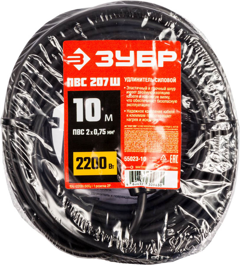 Удлинитель-шнур "ПВС 207-Ш", 10 м, 2200 Вт, 1 гнездо, ПВС 2х0,75 мм2, ЗУБР