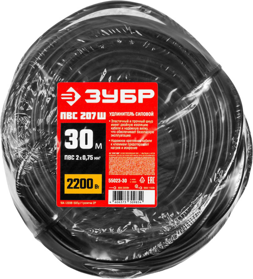 Удлинитель-шнур ПВС 207-Ш, 30 м, 2200 Вт, 1 гнездо, ПВС 2х0,75 мм2, ЗУБР