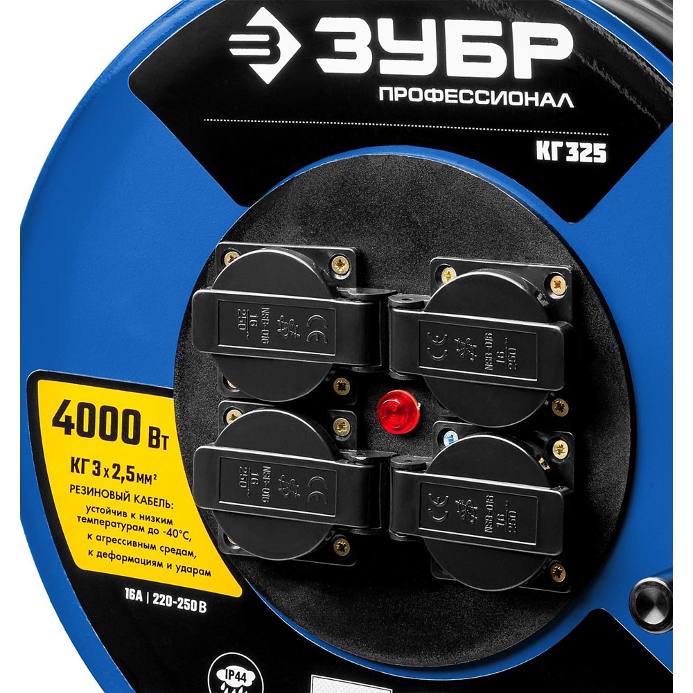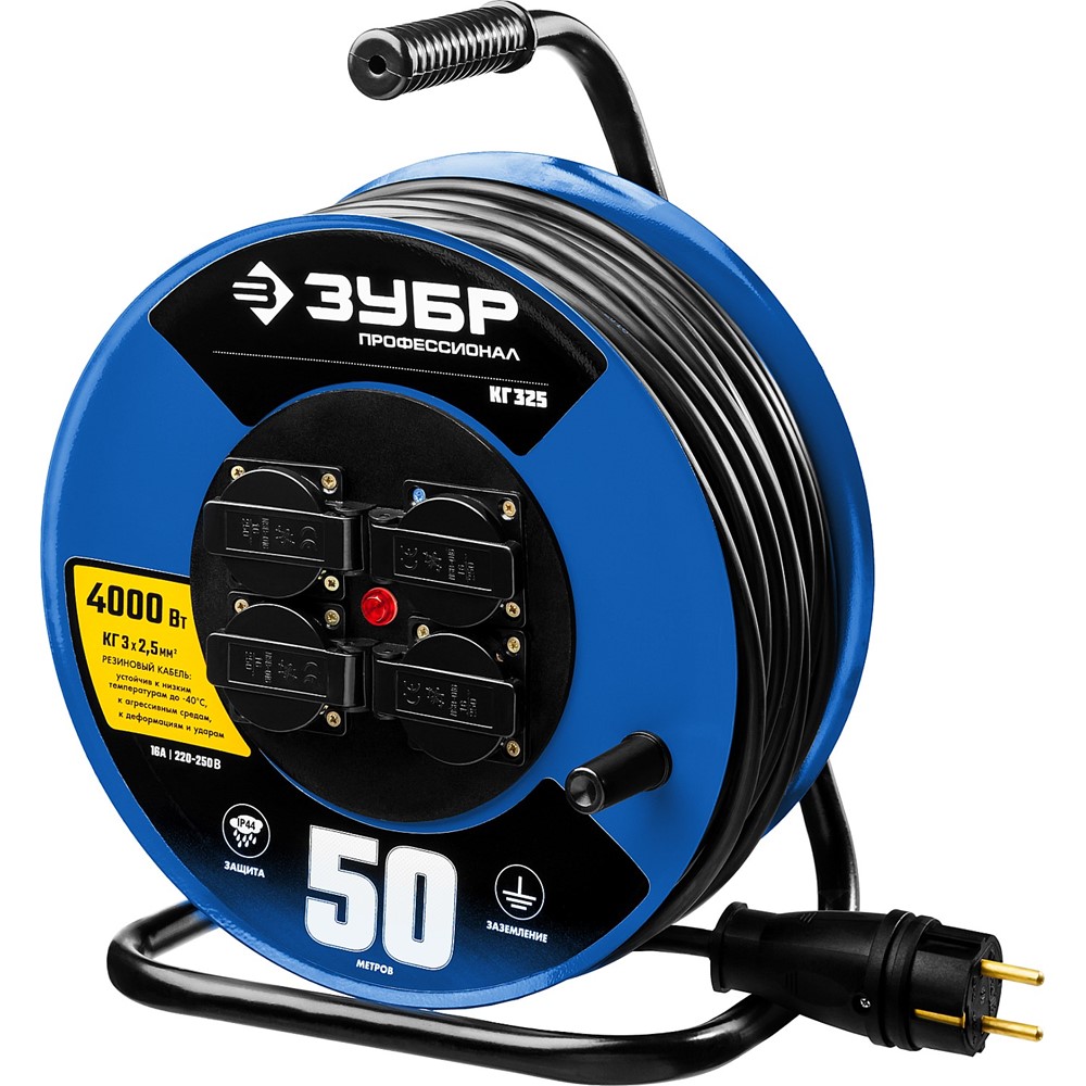 КГ 325 удлинитель на катушке, 50 м, 4000 Вт, 4 гнезда, IP44, КГ 3х2,5 кв мм, ЗУБР Профессионал