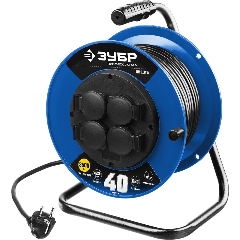 Удлинитель на катушке ПВС 315, 40 м, 3500 Вт, 4 гнезда, IP44, ПВС 3х1,5 кв мм, ЗУБР Профессионал