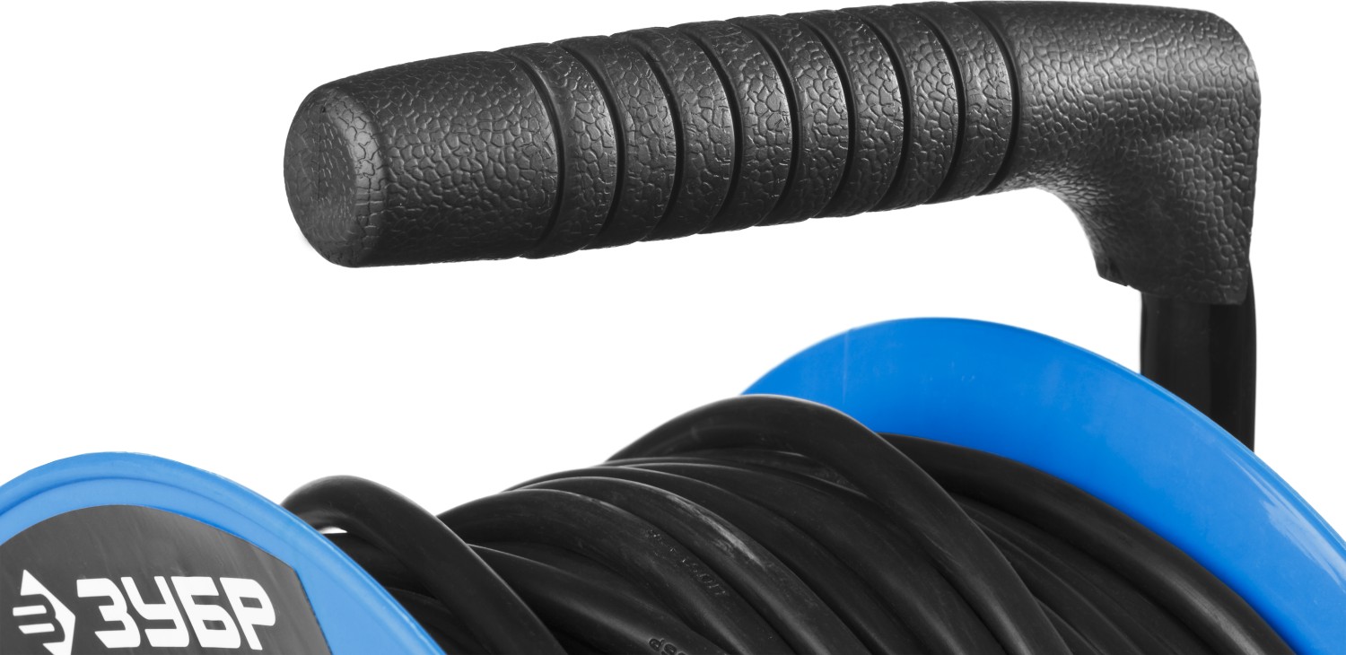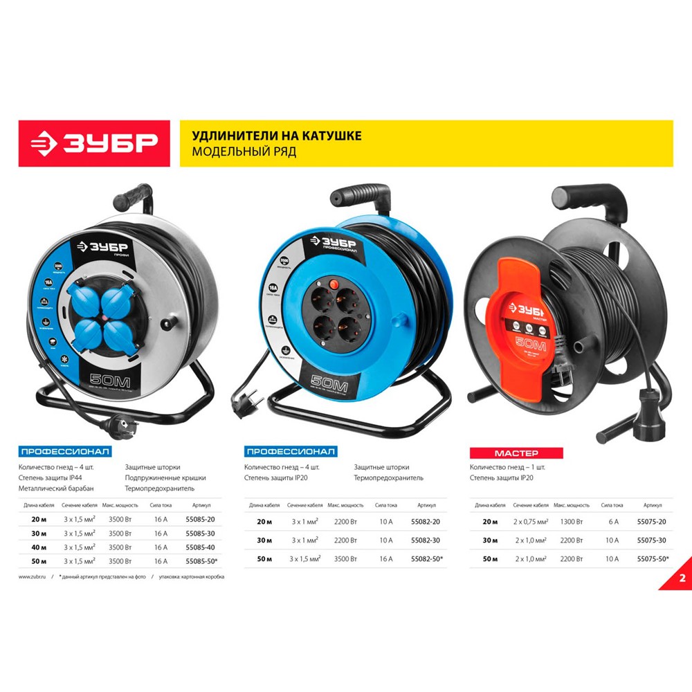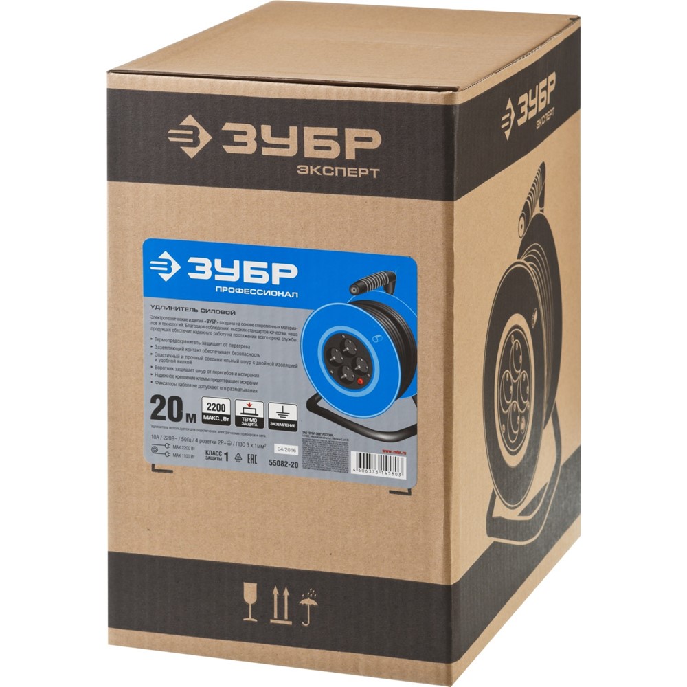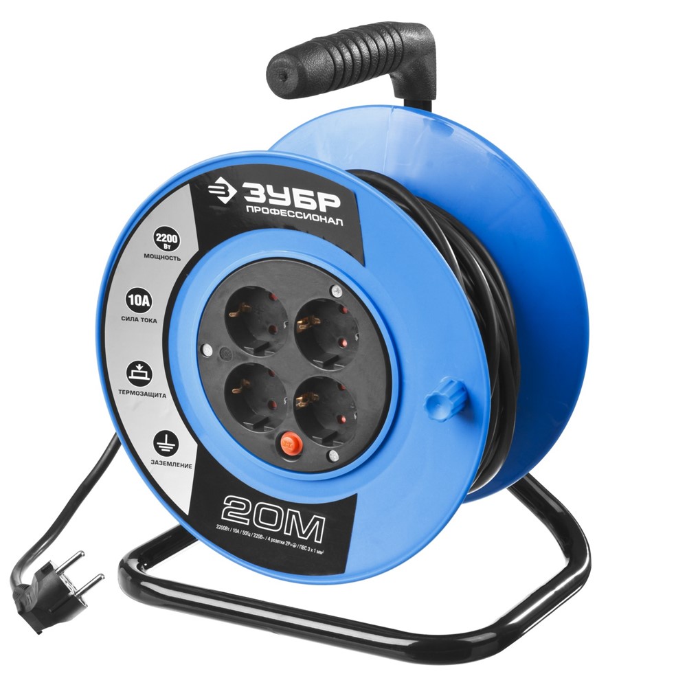 ЗУБР 20 м, 2200 Вт, 4 гнезда, IP20, ПВС 3x1,0 кв мм, удлинитель на катушке 55082-20