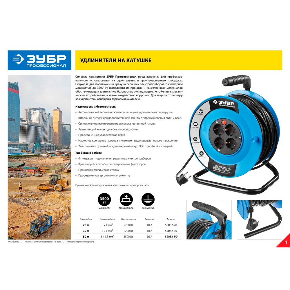 Удлинитель на катушке ЗУБР 55082-20, предназначен для подключения сразу нескольких электроприборов с суммарной мощностью до 2200 Вт. Удлинитель выполнен из прочных и качественных материалов. Для защиты от выхода из строя из-за перегрузок изделие оснащено термовыключателем.