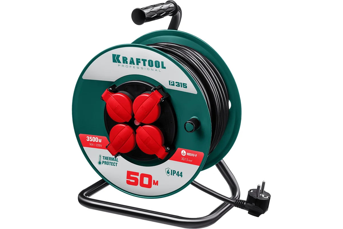 - Для безопасного и легкого перемещения силового удлинителя KRAFTOOL по рабочей площадке предусмотрена прорезиненная эргономичная рукоятка