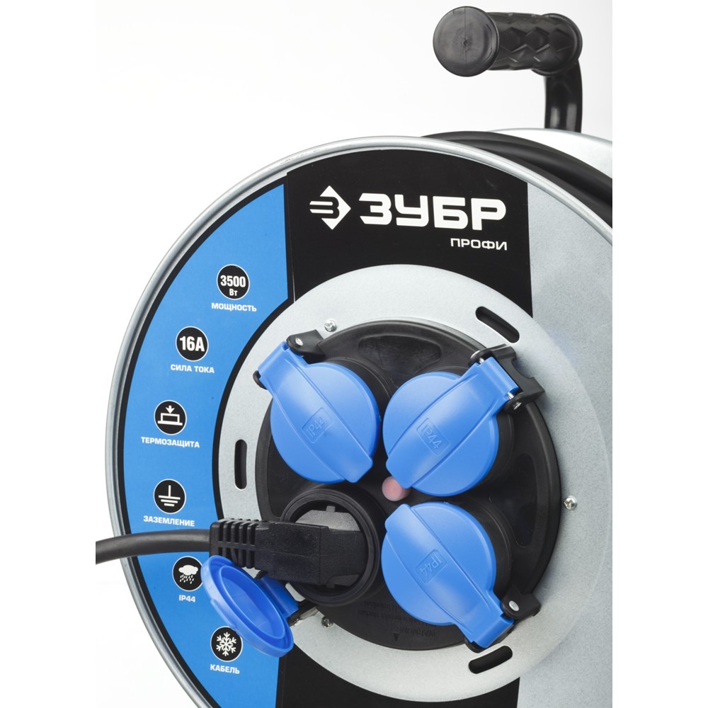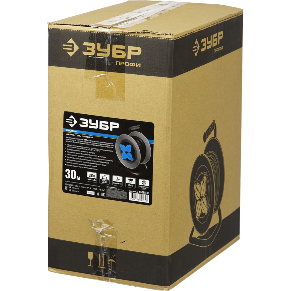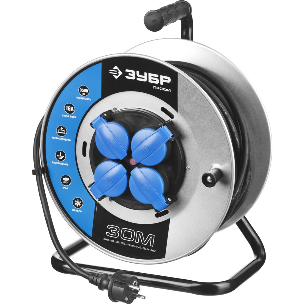 ЗУБР 30 м, 3500 Вт, 4 гнезда, IP44, КГ 3x1,5 кв мм, удлинитель на катушке 55085-30