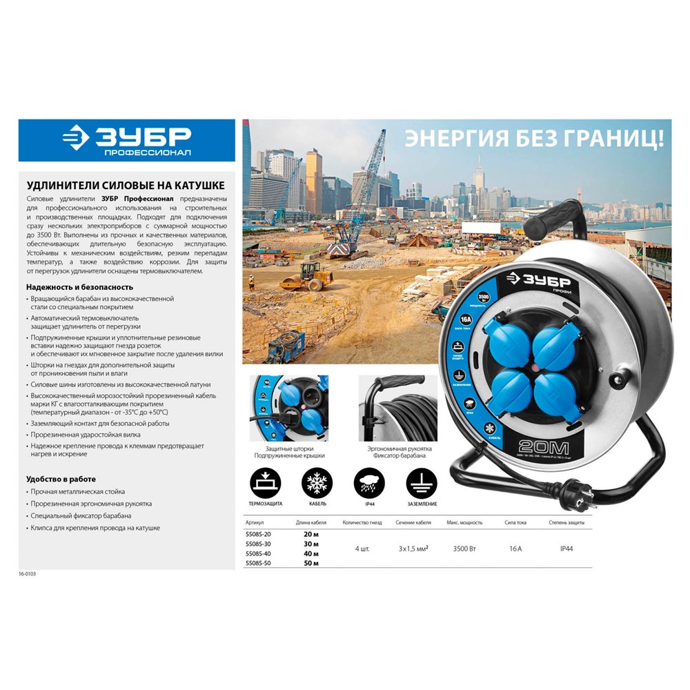 Удлинитель на катушке ЗУБР 55085-30, предназначен для подключения сразу нескольких электроприборов с суммарной мощностью до 3500 Вт. Удлинитель выполнен из прочных и качественных материалов, устойчив к механическим повреждениям, резким перепадам температур, а также появлению коррозии. Для защиты от выхода из строя из-за перегрузок изделие оснащено термовыключателем.