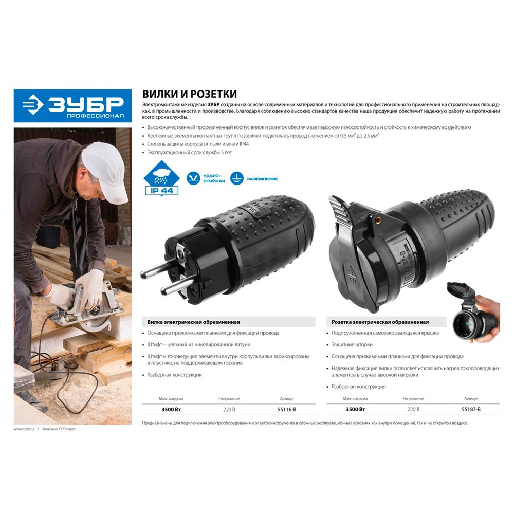 Электророзетка для удлинителя ЗУБР 55187-B, предназначена для подключения мобильного и стационарного оборудования на удалении от стационарной розетки. Степень защиты IP44, защитная крышка, каучуковый корпус. Оснащена прижимными планками для фиксации провода. Надежная фиксация вилки позволяет исключить нагрев токопроводящих элементов в случае высокой нагрузки. Разборная конструкция.