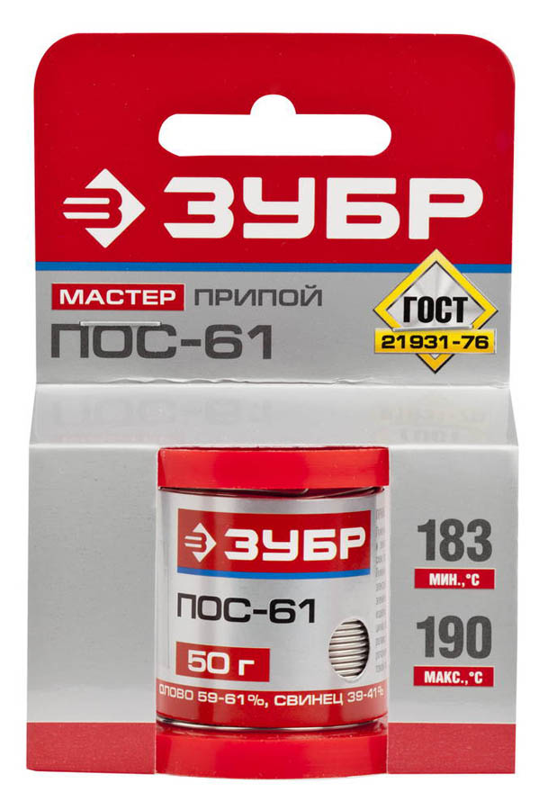 Припой для пайки ЗУБР 55450-050-10, предназначен для проведения паяльных работ. Лужение и пайка элементов электро- и радиоаппаратуры, печатных схем, точных приборов с высокогерметичными швами, где недопустим перегрев; пайка жести, обмоток электрических машин, монтажных элементов, моточных и кабельных изделий, радиаторов и листового цинка, оцинкованных деталей холодильных агрегатов, теплообменников, электроламп, кабельных оболочек, тонколистовой упаковки. Применяется при пайке изделий из меди, цинка, железа. Соответствует ГОСТ 21931-76.