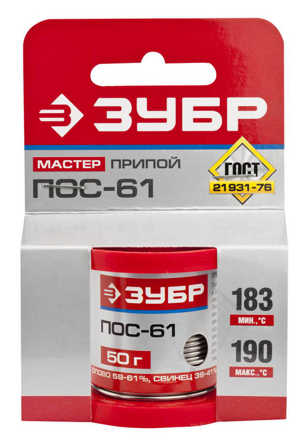 Припой для пайки ЗУБР 55450-050-15, предназначен для проведения паяльных работ. Лужение и пайка элементов электро- и радиоаппаратуры, печатных схем, точных приборов с высокогерметичными швами, где недопустим перегрев; пайка жести, обмоток электрических машин, монтажных элементов, моточных и кабельных изделий, радиаторов и листового цинка, оцинкованных деталей холодильных агрегатов, теплообменников, электроламп, кабельных оболочек, тонколистовой упаковки. Применяется при пайке изделий из меди, цинка, железа. Соответствует ГОСТ 21931-76.