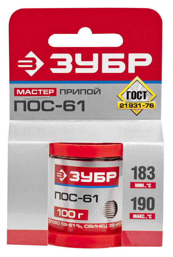 Припой для пайки ЗУБР 55450-100-10, предназначен для проведения паяльных работ. Лужение и пайка элементов электро- и радиоаппаратуры, печатных схем, точных приборов с высокогерметичными швами, где недопустим перегрев; пайка жести, обмоток электрических машин, монтажных элементов, моточных и кабельных изделий, радиаторов и листового цинка, оцинкованных деталей холодильных агрегатов, теплообменников, электроламп, кабельных оболочек, тонколистовой упаковки. Применяется при пайке изделий из меди, цинка, железа. Соответствует ГОСТ 21931-76.