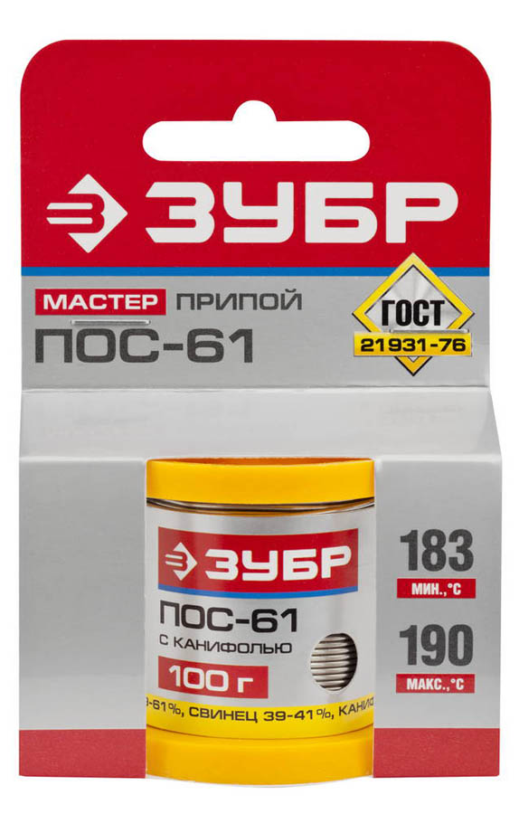 Припой для пайки ЗУБР 55450-100-10C, предназначен для проведения паяльных работ. Лужение и пайка элементов электро- и радиоаппаратуры, печатных схем, точных приборов с высокогерметичными швами, где недопустим перегрев; пайка жести, обмоток электрических машин, монтажных элементов, моточных и кабельных изделий, радиаторов и листового цинка, оцинкованных деталей холодильных агрегатов, теплообменников, электроламп, кабельных оболочек, тонколистовой упаковки. Применяется при пайке изделий из меди, цинка, железа. Соответствует ГОСТ 21931-76.