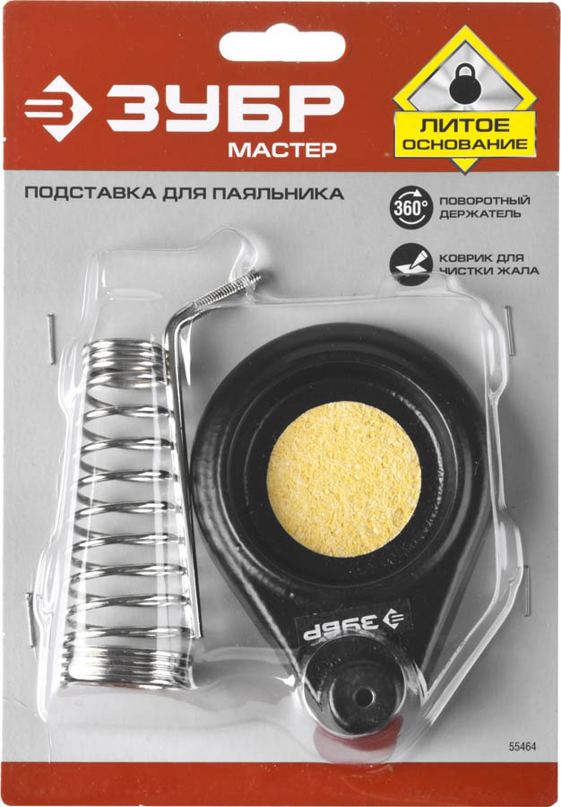 Подставка для паяльника литая ЗУБР 55464 применяется для безопасности при паяльных работах. Направляющая подставки сделана так, что паяльник помещается легко и удобно. В подставке предусмотрено специальное место для очистки жала паяльника.