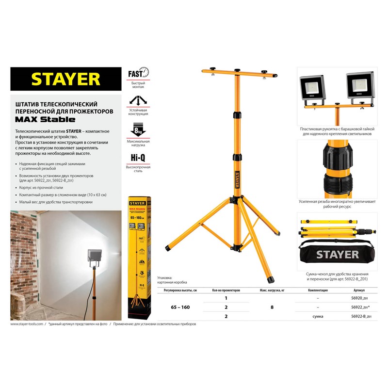 Штатив STAYER 56922, предназначен для установки двух прожекторов. Используется внутри помещений. Регулируется по высоте от 65 до 160 см. Легко и быстро устанавливается. Имеет планку для одновременной установки двух прожекторов. Изготовлен из высокопрочной стали и выдерживает максимальную нагрузку — 8 кг. Размер в сложенном виде — 10х63 см. Диаметр основания треноги — 96 см.