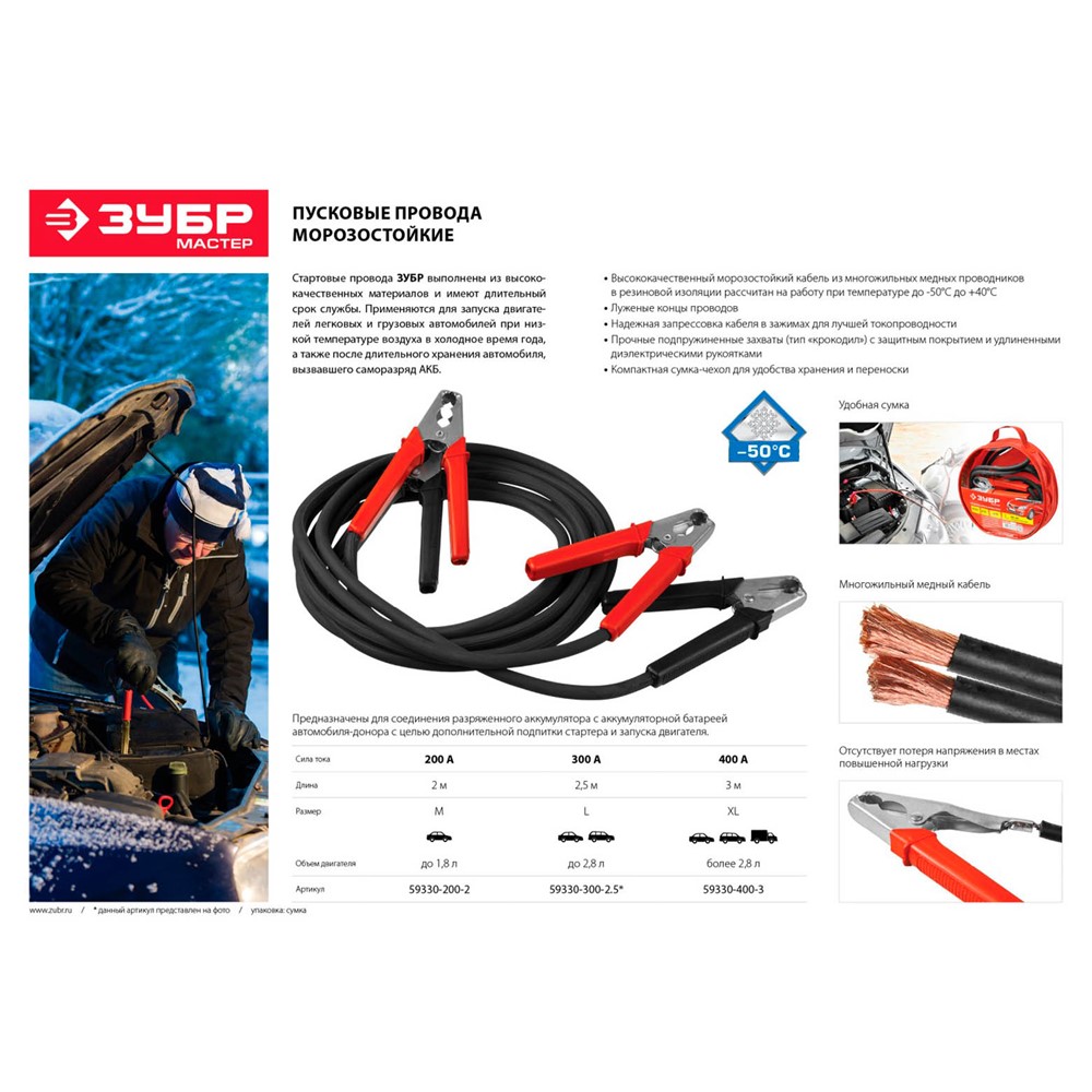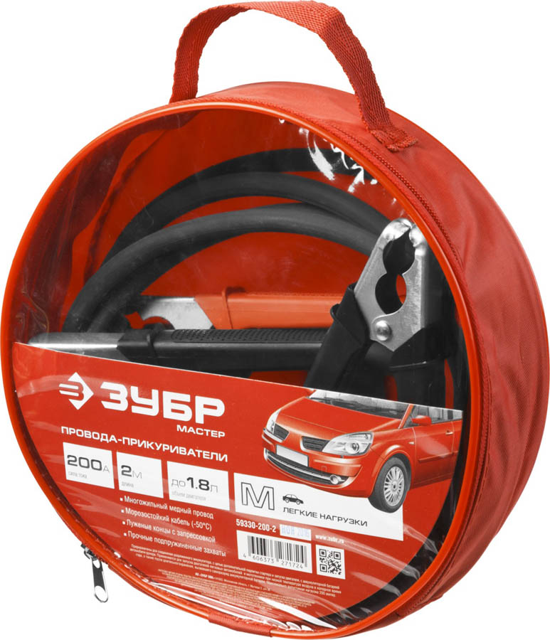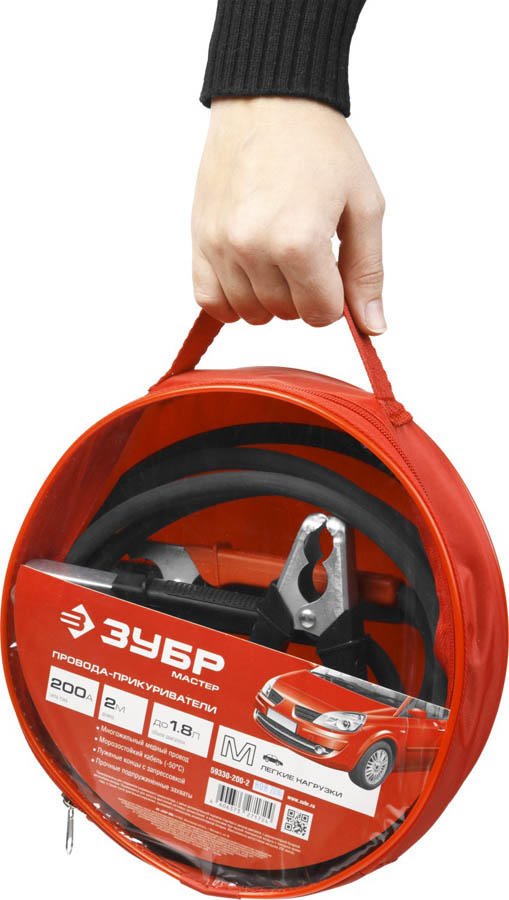 Провода-прикуриватели ЗУБР 59330-200-2, предназначены для соединения разряженного аккумулятора, с целью дополнительной подпитки стартера и запуска двигателя, с аккумуляторной батареей автомобиля-донора. Применяются для запуска двигателей легковых автомобилей и мототехники при низкой температуре воздуха в холодное время года, а также после длительного хранения, вызвавшего саморазряд аккумуляторной батареи. МАКСИМАЛЬНО ДОПУСТИМАЯ НАГРУЗКА 200 АМПЕР.