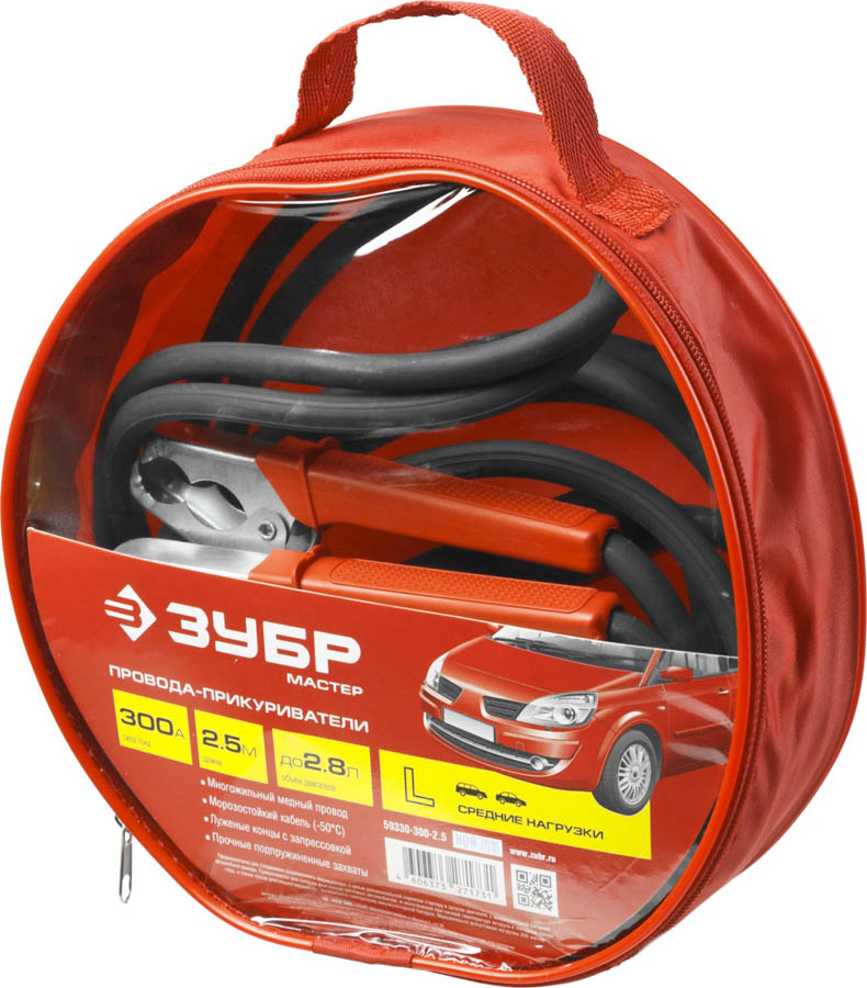 Провода-прикуриватели ЗУБР 59330-300-2.5, предназначены для соединения разряженного аккумулятора, с целью дополнительной подпитки стартера и запуска двигателя, с аккумуляторной батареей автомобиля-донора. Применяются для запуска двигателей легковых автомобилей и мототехники при низкой температуре воздуха в холодное время года, а также после длительного хранения, вызвавшего саморазряд аккумуляторной батареи. МАКСИМАЛЬНО ДОПУСТИМАЯ НАГРУЗКА 300 АМПЕР.