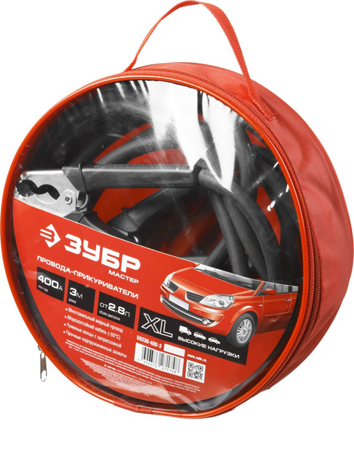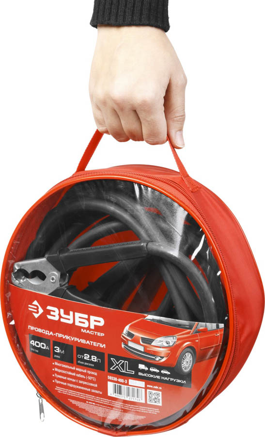Провода-прикуриватели ЗУБР 59330-400-3, предназначены для соединения разряженного аккумулятора, с целью дополнительной подпитки стартера и запуска двигателя, с аккумуляторной батареей автомобиля-донора. Применяются для запуска двигателей легковых автомобилей и мототехники при низкой температуре воздуха в холодное время года, а также после длительного хранения, вызвавшего саморазряд аккумуляторной батареи. МАКСИМАЛЬНО ДОПУСТИМАЯ НАГРУЗКА 400 АМПЕР.