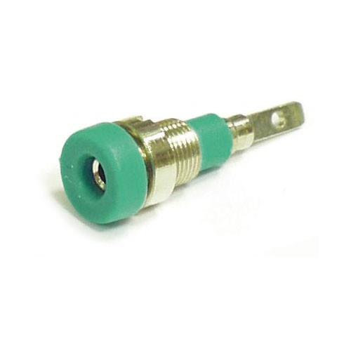 Гнездо (розетка) 623-green с внутренним диаметром 2 мм, с ножевым соединением. Гаечное крепление с шайбой, диаметр 6 мм, длина 11 мм, общая длина 24 мм. Цвет зеленый.