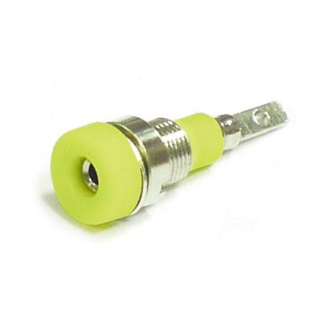Гнездо (розетка) 623-yellow с внутренним диаметром 2 мм, с ножевым соединением. Гаечное крепление с шайбой, диаметр 6 мм, длина 11 мм, общая длина 24 мм. Цвет желтый.