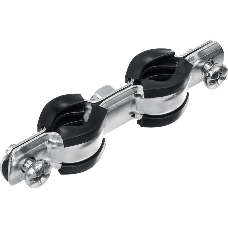 Стальные трубные хомуты выдерживают большие нагрузки и надежно фиксируют трубы различного назначения на любых основаниях. Труба прочно зажимается внутри хомута метрическими винтами. Двойной хомут позволяет компактно проложить парные трубопроводы и сэкономить на материалах и времени монтажа. Уплотнитель из высококачественной резины обеспечивает идеальную шумоизоляцию.