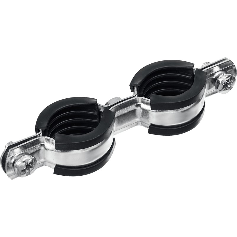 Стальные трубные хомуты выдерживают большие нагрузки и надежно фиксируют трубы различного назначения на любых основаниях. Труба прочно зажимается внутри хомута метрическими винтами. Двойной хомут позволяет компактно проложить парные трубопроводы и сэкономить на материалах и времени монтажа. Уплотнитель из высококачественной резины обеспечивает идеальную шумоизоляцию.