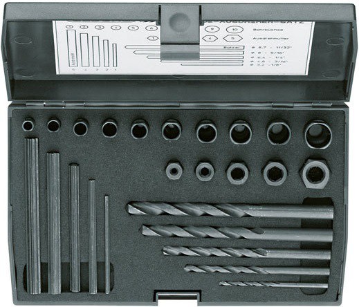 - В удобном футляре из пластмассы со сверлами, направляющими, вывертывающими штифтами и гайками