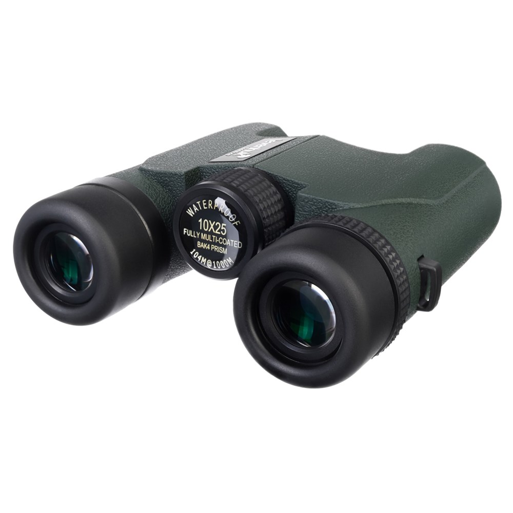 Бинокль Levenhuk Karma PRO 10x25 – прекрасный подарок для любителей активного отдыха. Благодаря небольшим размерам бинокль легко поместится в сумку или даже карман. Великолепная просветленная оптика из высококлассного бариевого крона BaK-4 формирует картинку высокого качества, а широкое поле зрения особенно удобно для обзорных наблюдений и слежения за подвижными целями. Прибор выпускается в прочном герметичном корпусе – он легко выдержит даже самые сложные условия. Конструкция бинокля продумана до мелочей. Оптическая схема построена на roof-призмах – это позволило сделать прибор очень небольшим. Окуляры состоят из четырех элементов, объединенных в три группы, поэтому изображение получается максимально четким, без искажений. Кроме того, на линзы нанесено полное многослойное просветляющее покрытие, которое повышает яркость и контрастность картинки и обеспечивает правильную цветопередачу. Корпус наполнен азотом, так что вы смело можете вести наблюдения даже в непогоду. Эргономичность бинокля оценят самые требовательные пользователи. Levenhuk Karma PRO 10x25 легко подстроить под особенности его владельца: межзрачковое расстояние регулируется, есть возможность настройки диоптрий. Окуляры снабжены поворотно-выдвижными наглазниками – они имеют плавный ход и надежно фиксируются в выбранном положении. Небольшой удобный корпус покрыт плотной резиновой оболочкой темно-зеленого цвета – благодаря рельефной поверхности прибор не выскальзывает из рук. Бинокль полностью водонепроницаем.
