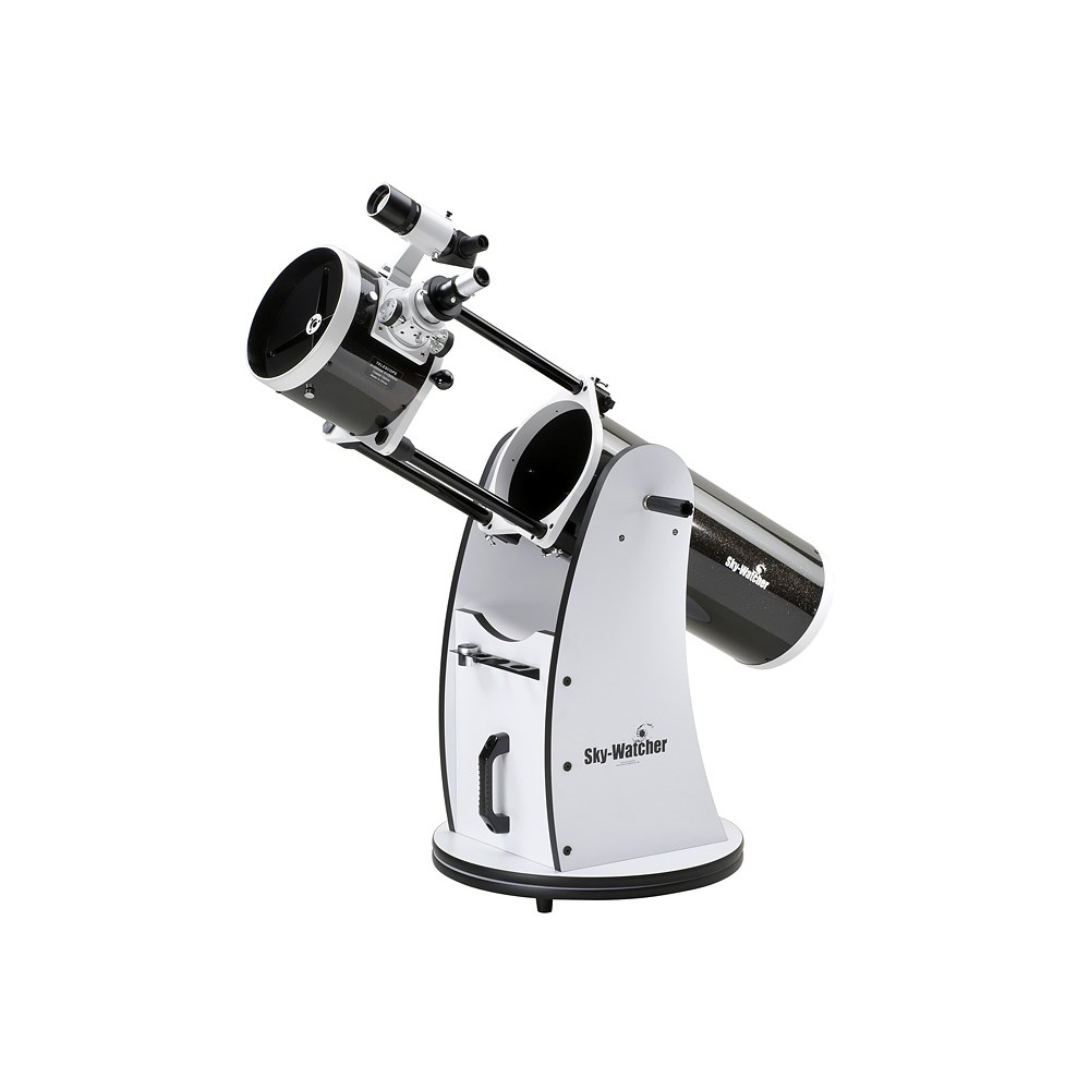 Рефлектор Ньютона. Диаметр главного зеркала: 203 мм. Фокусное расстояние: 1200 мм. Sky-Watcher Dob 8" (200/1200) Retractable – это высококачественный зеркальный телескоп на азимутальной монтировке Добсона. Особенностью этой модели является складная конструкция оптической трубы. В сложенном виде труба в полтора раза короче, чем в рабочем состоянии, поэтому ее удобно хранить и перевозить. Телескоп прекрасно подходит для наблюдений за городом. Оптика Зеркальный телескоп формирует яркую картинку, полностью свободную от хроматических аберраций. Главное зеркало изготовлено из оптического стекла высокого качества, поэтому изображение получается чистым и четким. Вторичное зеркало зафиксировано с помощью сверхтонких растяжек, не мешающих наблюдению. Для настройки резкости используется фокусер Крейфорда с посадочным диаметром 2". В комплект входит переходник на 1,25" и два окуляра. Окуляр 20 мм дает 60-кратное увеличение, а окуляр 12,5 мм позволяет изучать астрономические объекты с увеличением 96 крат. Монтировка Оптическая труба устанавливается на азимутальную монтировку Добсона. Монтировка обеспечивает стабильное положение телескопа. Она проста в сборке и управлении.