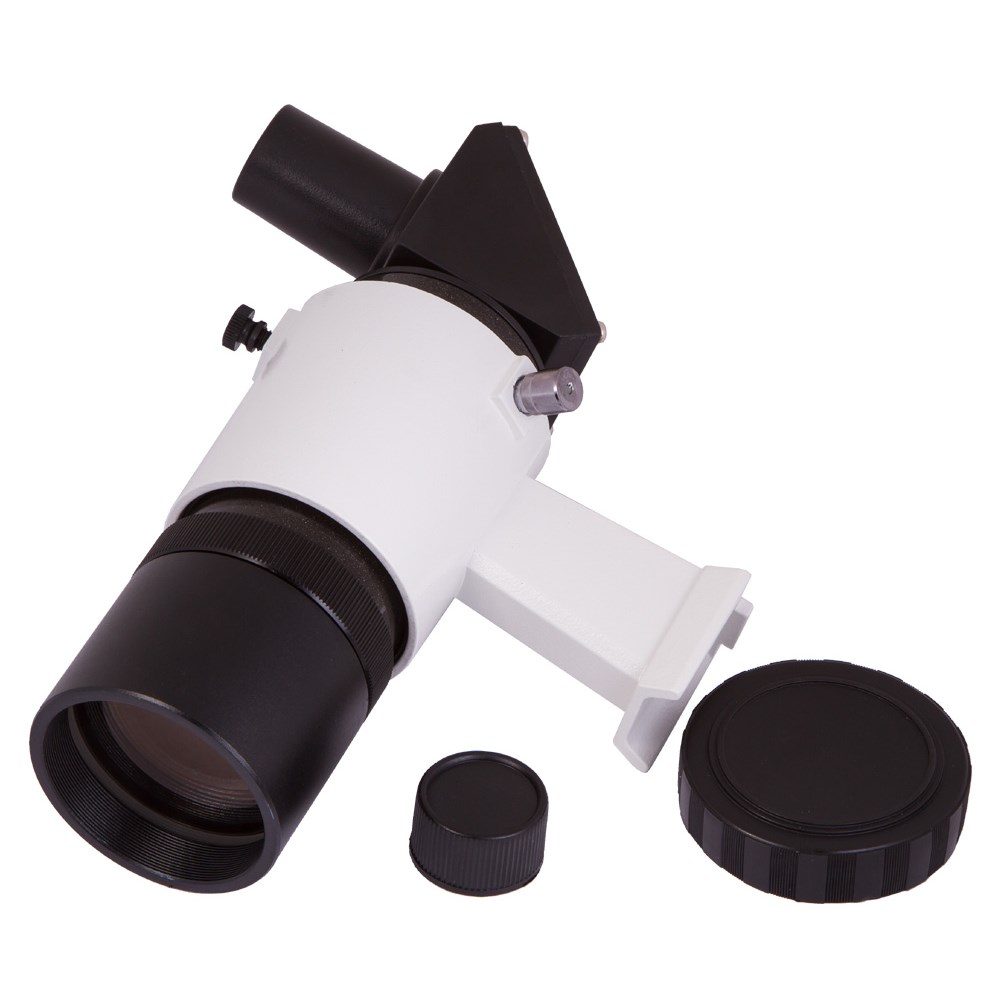 Ахроматический оптический искатель Sky-Watcher 8x50 применяется для поиска астрономических объектов. Полностью просветленная оптика формирует яркое и четкое изображение, а широкое поле зрения позволяет охватить взглядом большое пространство. Излом оптической оси на 90° дает возможность смотреть в искатель из наиболее удобного положения. Чтобы настроить резкость картинки, нужно повернуть объектив. Перекрестие хорошо различимо на фоне неба. Искатель поставляется с держателем для установки на оптическую трубу. Держатель позволяет выровнять трубку искателя относительно телескопа.
