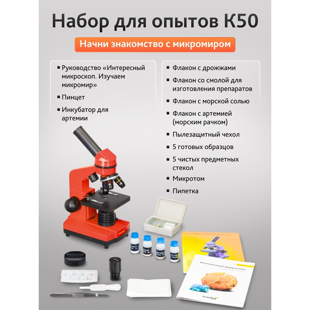 Как устроены растения, почему насекомые могут ходить по стенам, из чего делают бумагу – с помощью микроскопа Levenhuk Rainbow 2L камень ваш ребенок откроет множество удивительных тайн микромира. В комплект входит все, что нужно юному исследователю – от готовых препаратов до инструментов для создания собственных образцов для изучения. Оптика Линзы сделаны из качественного оптического стекла – оно отличается высокой прозрачностью и не искажает картинку. Благодаря многослойному просветляющему покрытию изображение получается четким и резким. В револьверном устройстве установлены три объектива, с которыми микроскоп дает увеличения 40, 100 и 400 крат. Чтобы поменять кратность, нужно просто повернуть револьверное устройство. Подсветка Микроскоп снабжен двумя встроенными светодиодными осветителями. Нижняя подсветка нужна, чтобы рассматривать прозрачные образцы, например тонкие срезы растений или воду из аквариума. Чтобы изучить монету или лист бумаги, нужно включить верхний осветитель. Прибор подходит и для работы с полупрозрачными объектами – для этого используются обе подсветки одновременно. Регулировка яркости позволяет подобрать оптимальный уровень освещения для каждого препарата. Корпус и питание Корпус сделан из качественного пластика, поэтому микроскоп получился одновременно надежным и легким. Для удобства окулярная насадка наклонена на 45°. Микроскоп может работать и от сети переменного тока, и от батареек. Внимание! Помните, что напряжение сети в России и большинстве европейских стран составляет 220–240 В. Если вы хотите использовать устройство в стране с другим стандартом сетевого напряжения, необходимо включать его в розетку только через соответствующий конвертер (преобразователь напряжения). Набор для опытов Микроскоп идеально подходит для первого знакомства с микромиром. В набор для опытовLevenhuk K50 входят готовые препараты, инструменты для работы с микроскопическими объектами и руководство с описаниями интереснейших экспериментов.