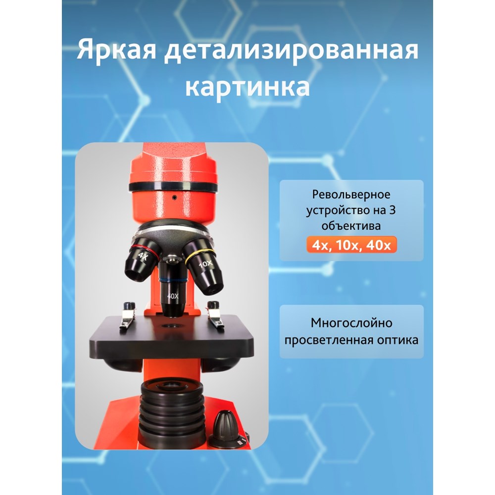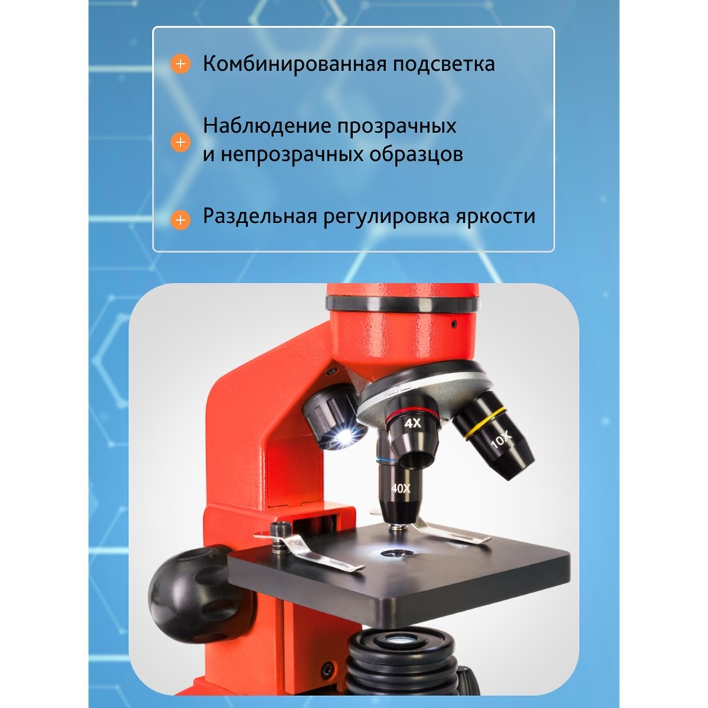 • Биологический микроскоп с увеличением от 40 до 400 крат • В линейке пять ярких цветов • Прочный и легкий пластиковый корпус • Нижняя и верхняя светодиодные подсветки • Набор для опытов с микроскопом в комплектеКомплектация: