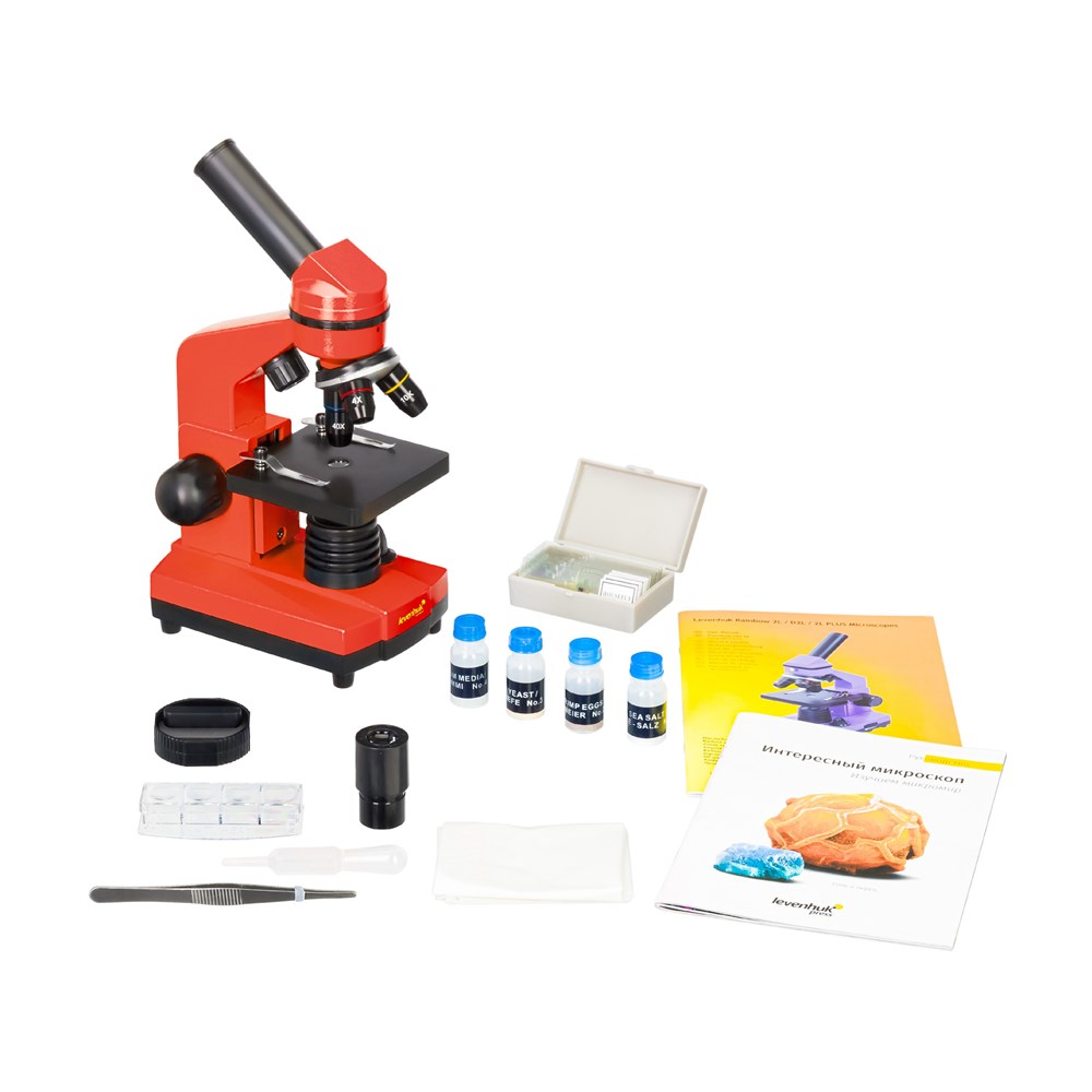 • Микроскоп • Объективы: 4х, 10х и 40х • Окуляр WF10х • Предметный столик с зажимами • Диск с диафрагмами • Конденсор • Встроенные нижний и верхний осветители на светодиодах • Сетевой адаптер (питание 220 В, 50 Гц) • Набор для опытов Levenhuk K50 • Инструкция по эксплуатации и гарантийный талон Набор для опытов Levenhuk K50: • Руководство «Интересный микроскоп. Изучаем микромир» • Пинцет • Инкубатор для артемии • Микротом • Флакон с дрожжами • Флакон со смолой для изготовления препаратов • Флакон с морской солью • Флакон с артемией (морским рачком) • 5 готовых образцов и 5 чистых предметных стекол • Пипетка • Пылезащитный чехол Микроскоп LevenhukRainbow 2L совместим с цифровыми камерами Levenhuk (камеры приобретаются отдельно). Камеры Levenhuk устанавливаются в окулярную трубку вместо окуляра.Технические характеристики