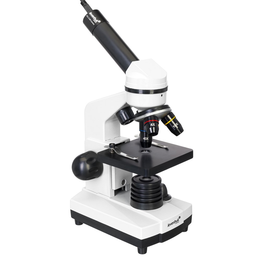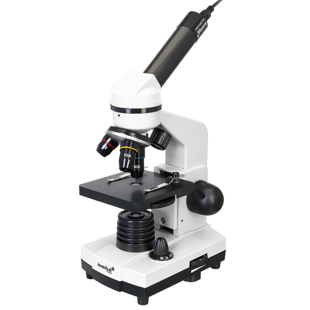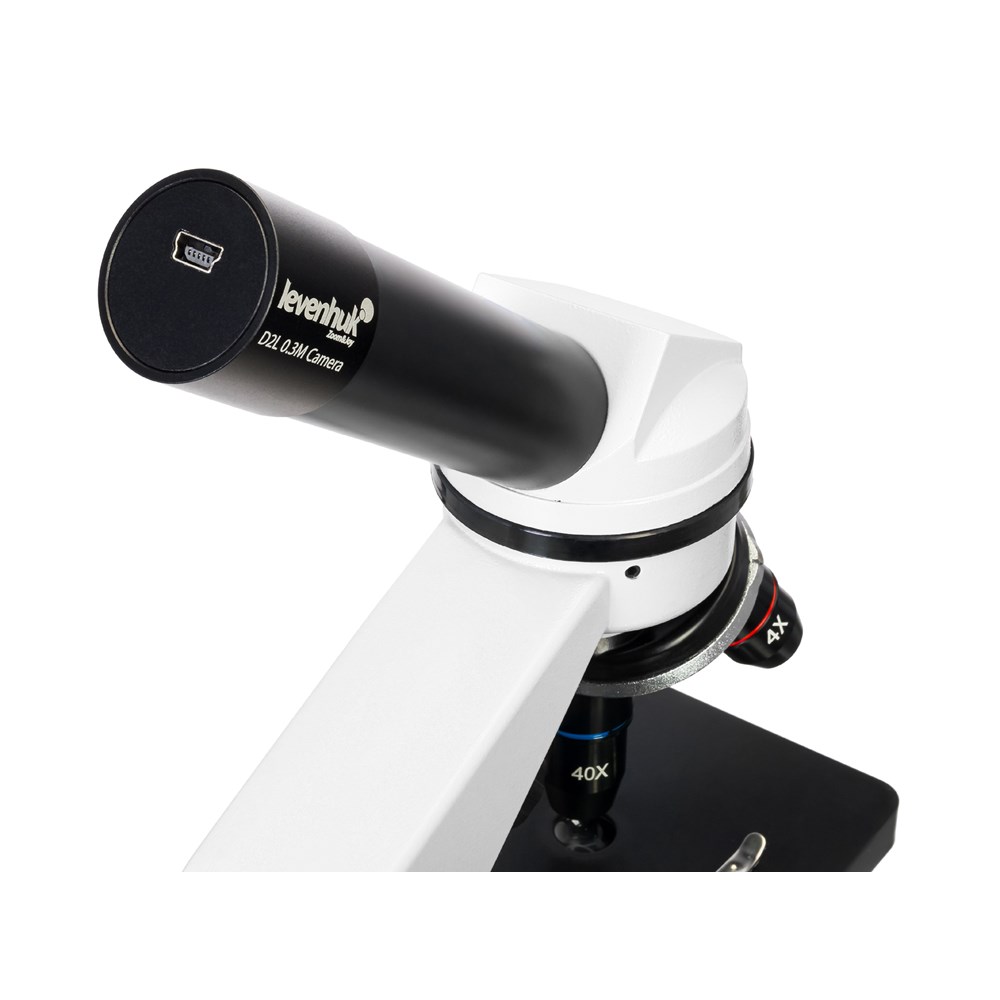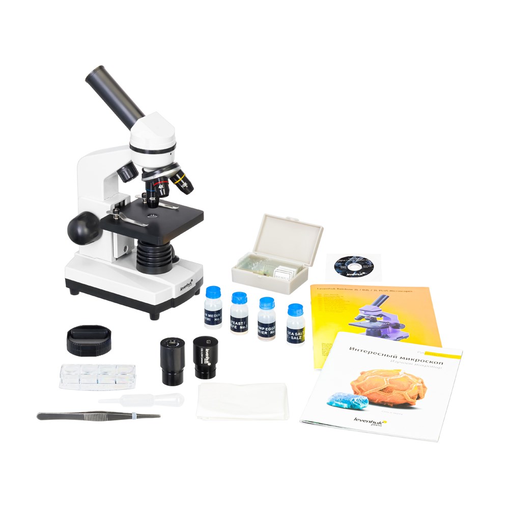 • Микроскоп • Объективы: 4х, 10х и 40х • Окуляр WF10х • Предметный столик с зажимами • Диск с диафрагмами • Конденсор • Встроенные нижний и верхний осветители на светодиодах • Сетевой адаптер (питание 220 В, 50 Гц) • Набор для опытов Levenhuk K50 • Цифровая камера 0,3 Мпикс • ПО для Windows (программа LevenhukToupView) • USB-кабель • Инструкция по эксплуатации и гарантийный талон Набор для опытов Levenhuk K50: • Руководство «Интересный микроскоп. Изучаем микромир» • Пинцет • Инкубатор для артемии • Микротом • Флакон с дрожжами • Флакон со смолой для изготовления препаратов • Флакон с морской солью • Флакон с артемией (морским рачком) • 5 готовых образцов и 5 чистых предметных стекол • Пипетка • Пылезащитный чехол Микроскоп LevenhukRainbow D2L также совместим с цифровыми камерами Levenhuk (дополнительные камеры приобретаются отдельно). Камеры Levenhuk устанавливаются в окулярную трубку вместо окуляра.Технические характеристики