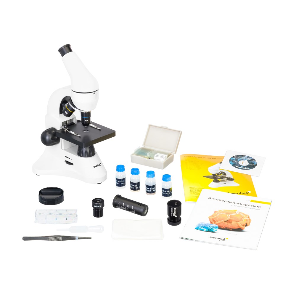 • Микроскоп • Объективы: 4х, 10х и 40хs • Окуляр WF16х • Линза Барлоу 2x • Предметный столик с зажимами • Диск с диафрагмами • Конденсор • Встроенные нижний и верхний осветители на светодиодах • Сетевой адаптер (питание 220 В, 50 Гц) • Пластиковый кейс • Набор для опытов Levenhuk K50 • Цифровая камера 2 Мпикс • ПО для Windows (программа LevenhukToupView) • USB-кабель • Инструкция по эксплуатации и гарантийный талон Набор для опытов Levenhuk K50: • Руководство «Интересный микроскоп. Изучаем микромир» • Пинцет • Инкубатор для артемии • Микротом • Флакон с дрожжами • Флакон со смолой для изготовления препаратов • Флакон с морской солью • Флакон с артемией (морским рачком) • 5 готовых образцов и 5 чистых предметных стекол • Пипетка • Пылезащитный чехол Микроскоп Levenhuk Rainbow D50L также совместим с цифровыми камерами Levenhuk (дополнительные камеры приобретаются отдельно). Камеры Levenhuk устанавливаются в окулярную трубку вместо окуляра.Технические характеристики