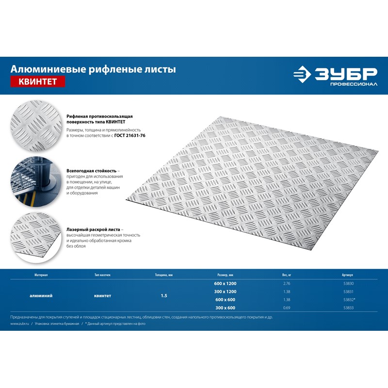Алюминиевый рифленый лист ЗУБР Квинтет 300х600 х1.5 мм
