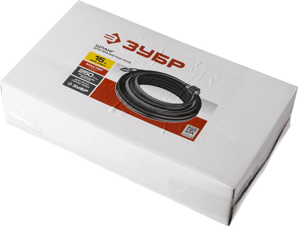 Шланг для прочистки труб ЗУБР 70414-375-15, предназначен для прочистки труб струей воды под давлением. Универсален для всех моделей моек ЗУБР.